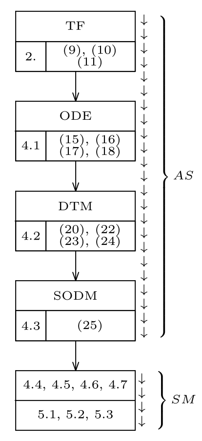 Figure 6. Flow-diagram of works for a software project to implement the Active Principle of parametric system identification in the class of linear, time-invariant, completely observable models. AS = application-specific and SM = standard matrix calculations. The paper section numbers and equation numbers (within parentheses) are shown