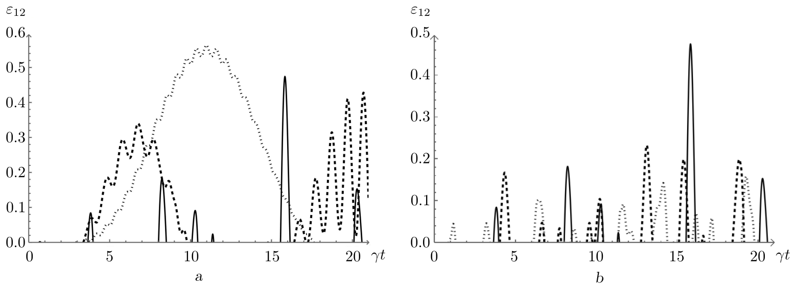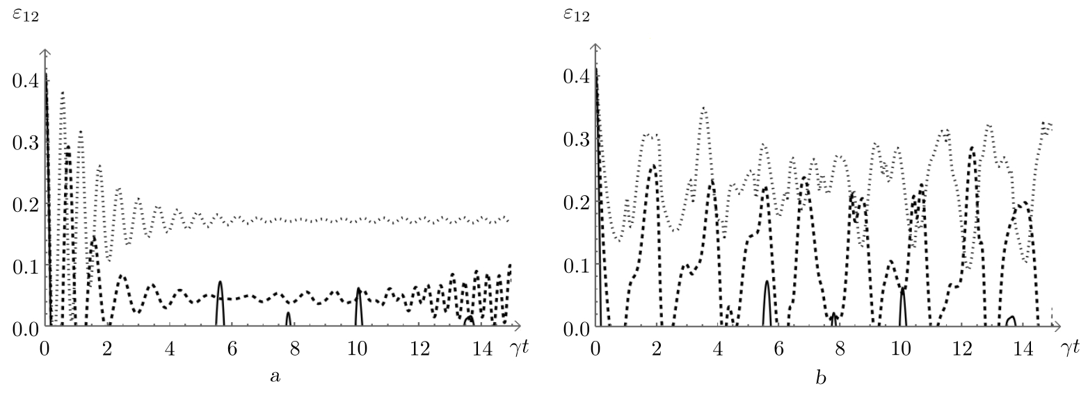 Рис. 1. Отрицательность $\varepsilon_{12}(t)$ как функция безразмерного времени $ \gamma t$ для начального сепарабельного состояния кубитов (1). Рисунок a: среднее число фотонов $\overline{m}=1.5$, параметр керровской нелинейности $\chi=0$ и расстройка: $\delta=0$ (сплошная линия), $\delta=6 \gamma$ (пунктирная линия), $\delta=10 \gamma$ (точечная линия). Рисунок b: среднее число фотонов $\overline{m}=1.5$, параметр расстройки $\delta=0$ и параметр керровской нелинейности: $\chi=0$ (сплошная линия), $\chi=2 \gamma$ (пунктирная линия), $\chi=3 \gamma$ (точечная линия)