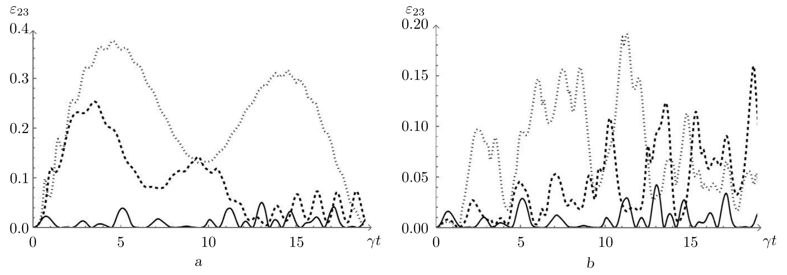 Рис. 2. Отрицательность $\varepsilon_{23}(t)$ как функция безразмерного времени $\gamma t$ для начального сепарабельного состояния кубитов (1). Рисунок a: среднее число фотонов $\overline{m}=3$, параметр керровской нелинейности $\chi=0$ и расстройка: $\delta=0$ (сплошная линия), $\delta=5 \gamma$ (пунктирная линия), $\delta=8 \gamma$ (точечная линия). Рисунок b: среднее число фотонов $\overline{m}=3$, параметр расстройки $\delta=0$ и параметр керровской нелинейности: $\chi=0$ (сплошная линия), $\chi=\gamma$ (пунктирная линия), $\chi=2 \gamma$ (точечная линия)