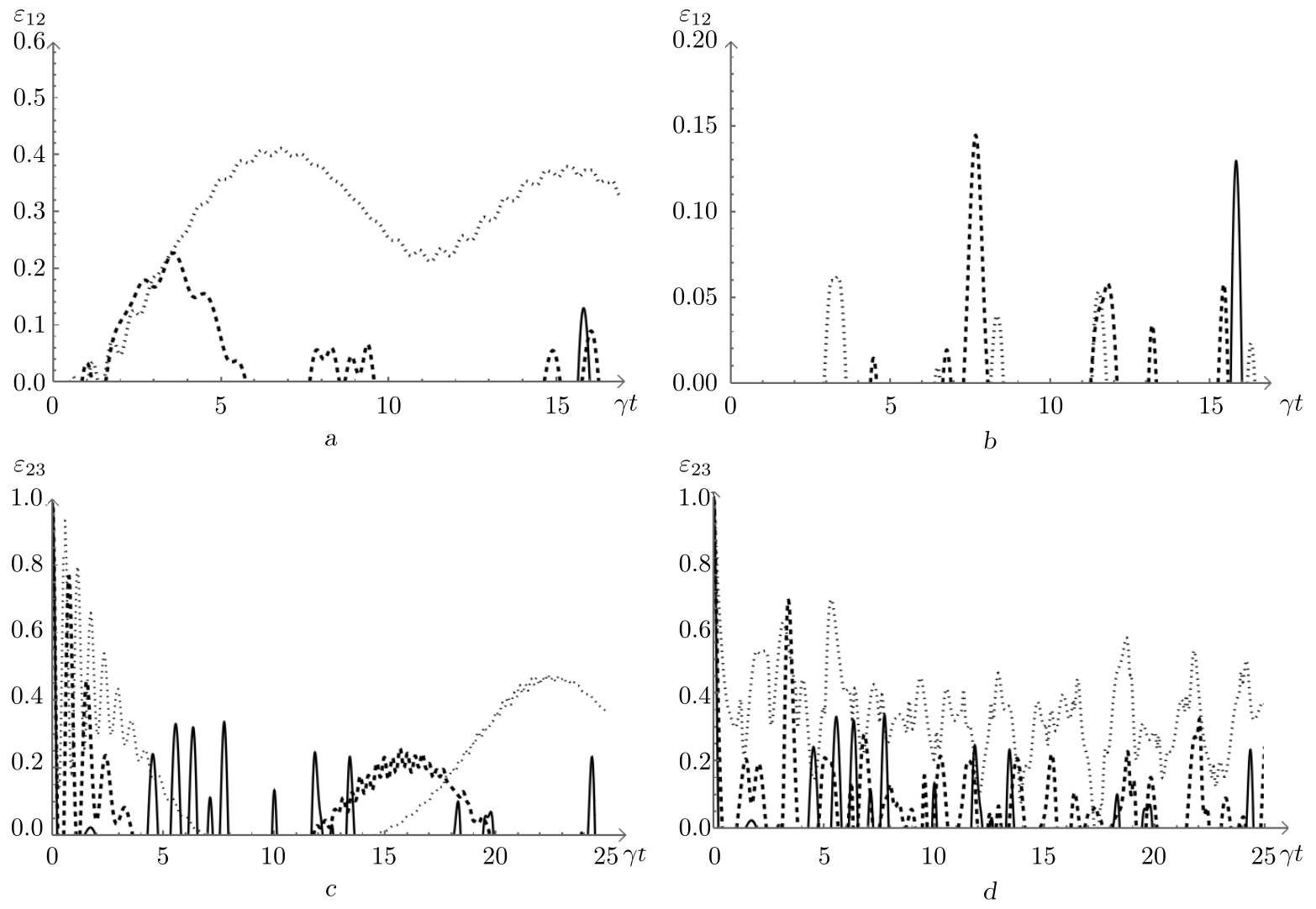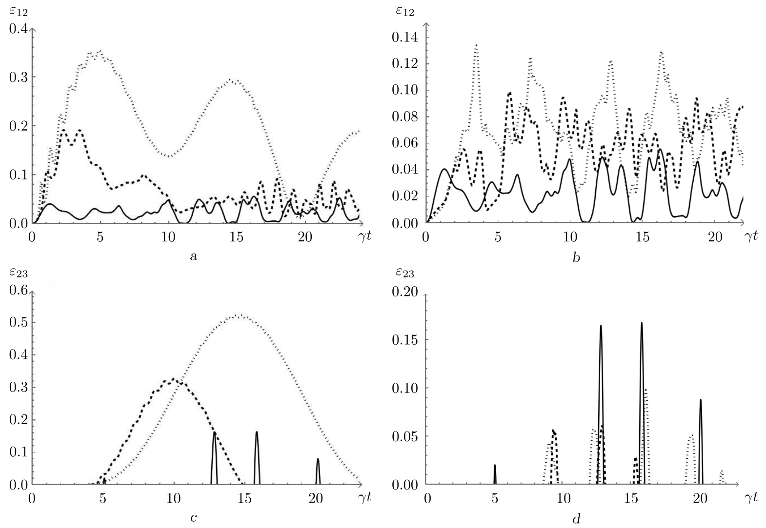 Рис. 4. Отрицательности $\varepsilon_{12}$ (a, b) и $\varepsilon_{23}$ (c, d) как функции безразмерного времени $\gamma t$ для начального бисепарабельного состояния кубитов (3). Рисунок a: среднее число фотонов $\overline{m}=1.5$, параметр керровской нелинейности $\chi=0$ и расстройка: $\delta=0$ (сплошная линия), $\delta=5 \gamma$ (пунктирная линия), $\delta=10 \gamma$ (точечная линия). Рисунок b: среднее число фотонов $\overline{m}=1.5$, параметр расстройки $\delta=0$ и параметр керровской нелинейности: $\chi=0$(сплошная линия), $\chi=2 \gamma$ (пунктирная линия), $\chi=3 \gamma$ (точечная линия). Рисунок c: среднее число фотонов $\overline{m}=4$, параметр керровской нелинейности $\chi=0$ и параметр расстройки: $\delta=0$ (сплошная линия), $\delta=7 \gamma$ (пунктирная линия), $\delta=10 \gamma$ (точечная линия). Рисунок d: среднее число фотонов $\overline{m}=4$, параметр расстройки $\delta=0$ и параметр керровской нелинейности: $\chi=0$ (сплошная линия), $\chi=\gamma$ (пунктирная линия), $\chi=2.5 \gamma$ (точечная линия). Во всех случаях $\beta={\pi}/{4}$
