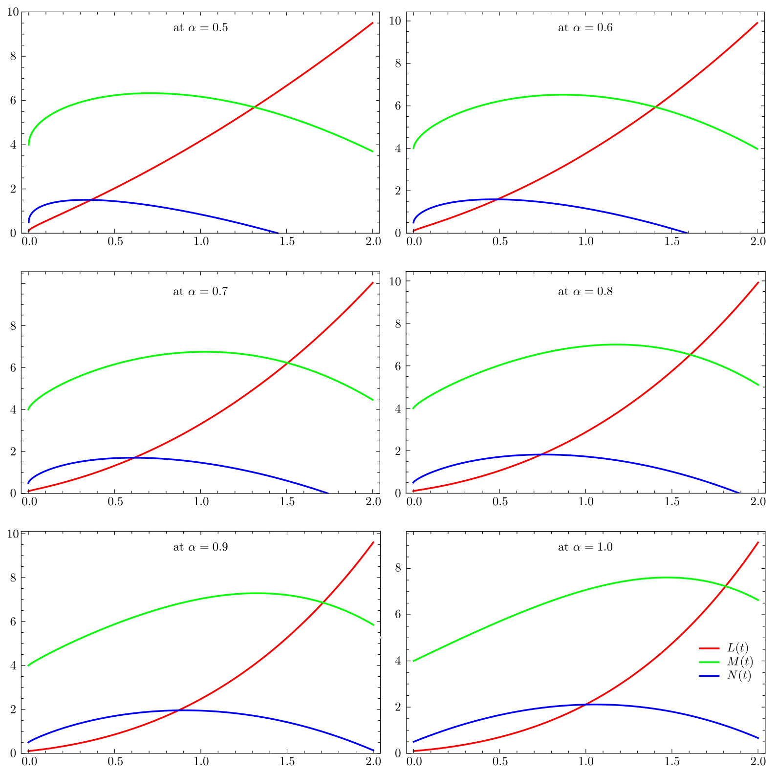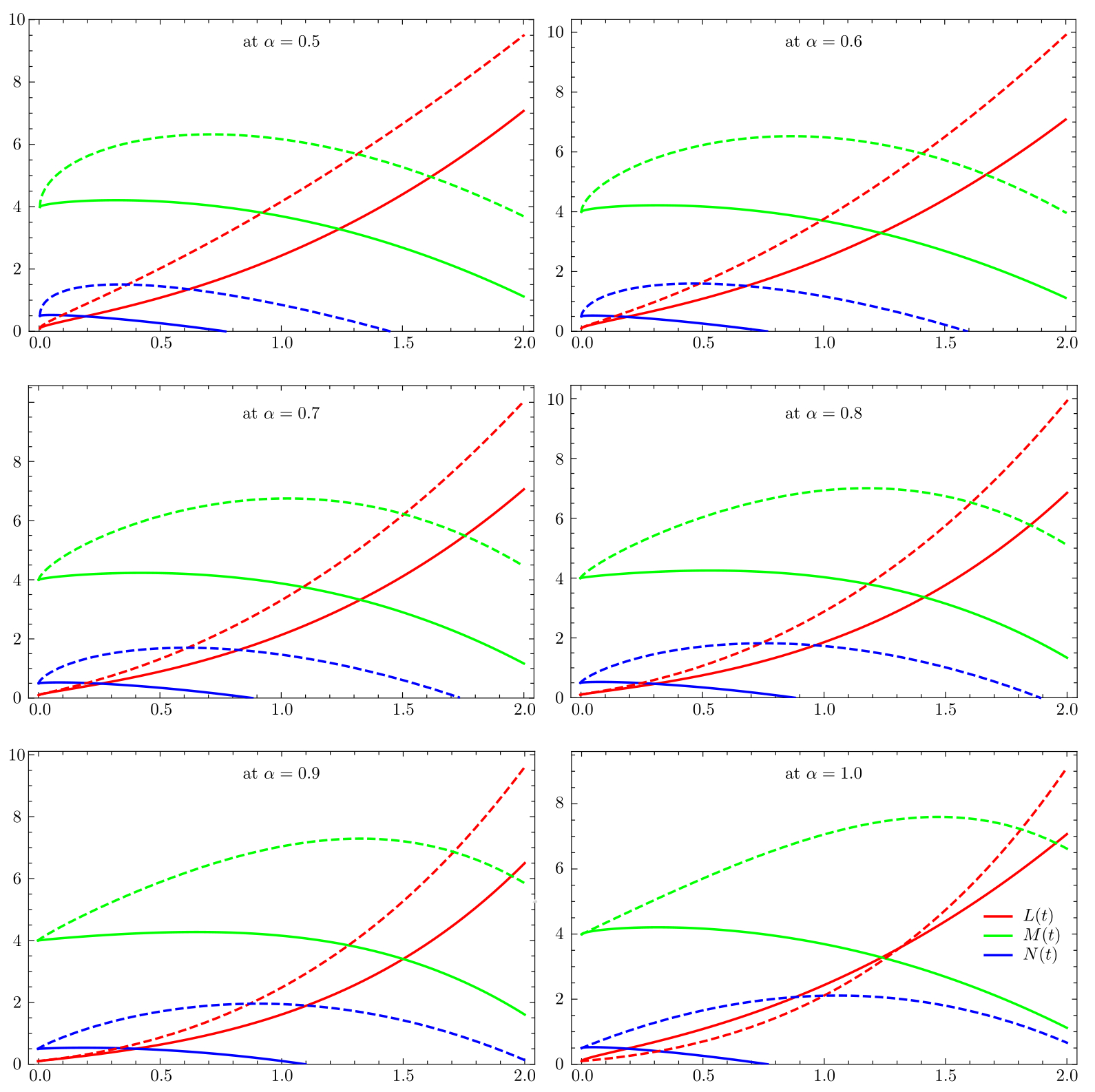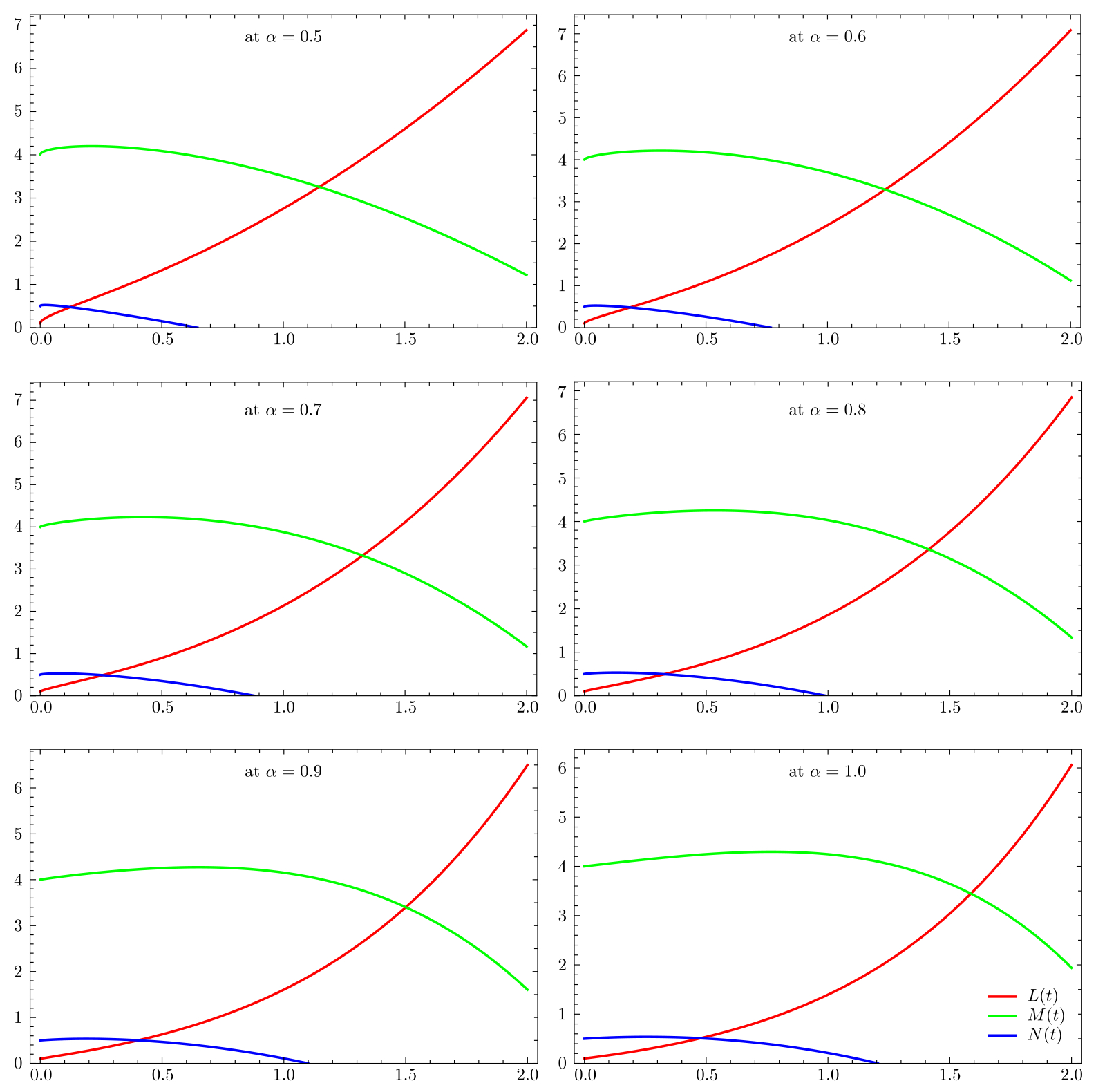 The Elzaki transform decomposition method produced the following 4th step approximate solutions by using the Eqs. (17), (18), and (19) in terms of interest rate $L(t)$, investment demand $M(t)$, and price index $N(t)$ at $\alpha=0.5$, 0.6, 0.7, 0.8, 0.9, 1.0.