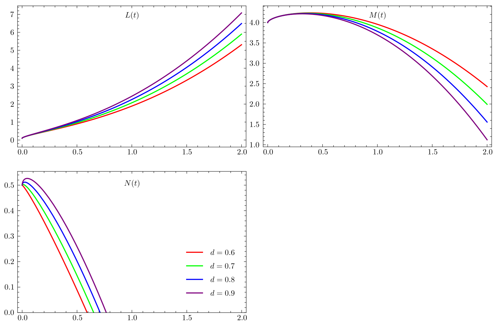 where time-dependent variables $L(t)$, $M(t)$, and $N(t)$ represent interest rate, investment demand, and price index, respectively. Furthermore, the saving coefficient is represented by $a$, $b$ stands for the cost per investment, $c$ indicates the elasticity of market demand or the elasticity of demand with respect to the rate of change in demand, and $d$ represents the critical minimum interest rate.