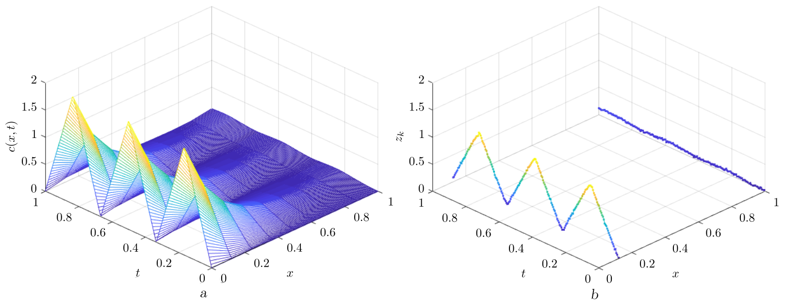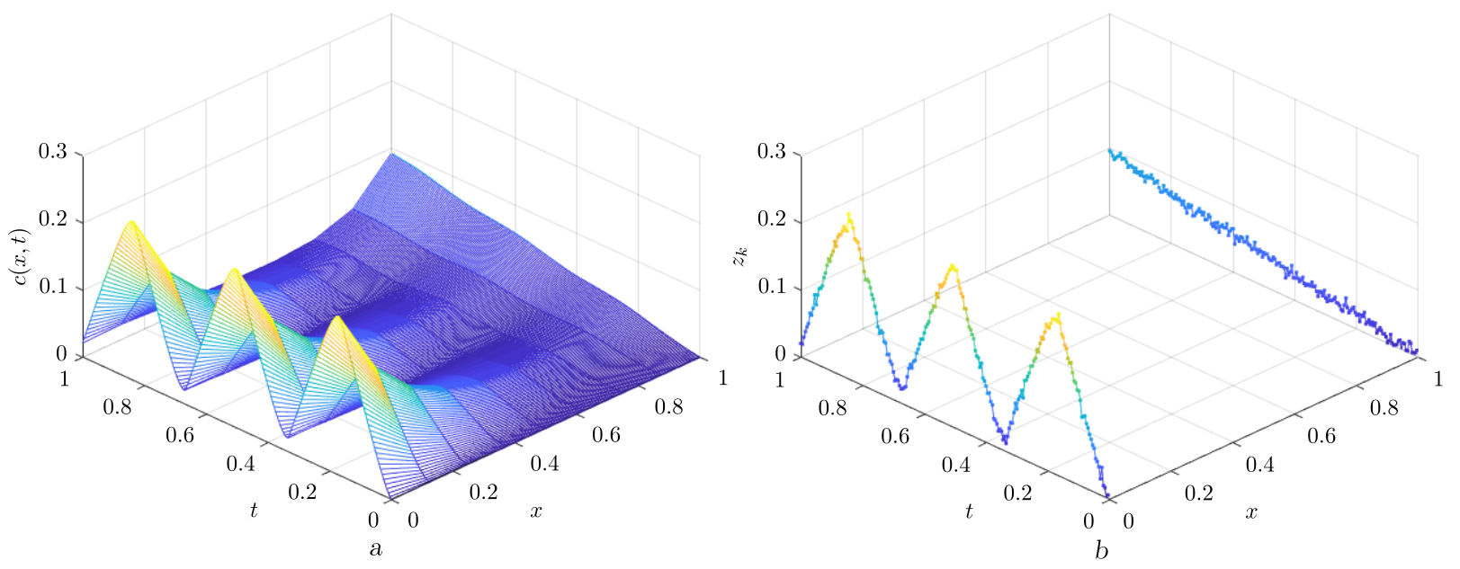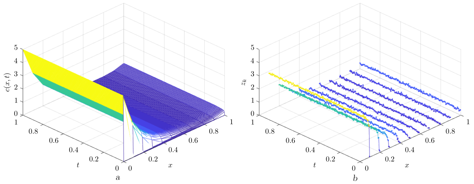 [Figure 5. Plots of the solution (a) and noisy measurements (b)]