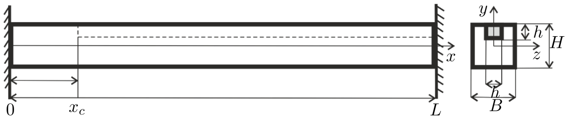 Рассматривается однородный изотропный прямоугольный стержень длины $L=1$ с продольным прямоугольным пазом, проходящий не по всей длине стержня, а от некоторой точки $x_{c}$ до правого конца (см. рис. 1). Предполагается, что оси симметрии поперечного сечения участка стержня без паза и с пазом совпадают, а стержень заделан на обеих концах. Поперечное сечение имеет высоту $H$ и ширину $B$. Прямоугольный паз имеет длину $l=L- x_{c}$, глубину $h$ и ширину $b$. В случае малого $b$ следует рассматривать прямоугольный паз как продольную трещину.