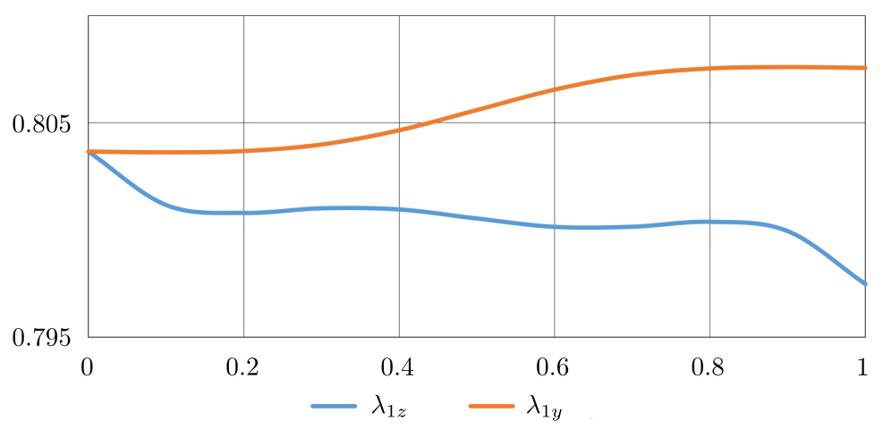 На рис. 2–4 приведены графические зависимости первых трех собственных значений стержня от длины паза. Рисунки показывают, что график собственных значений изгибных колебаний относительно оси $Oy$ растет, а относительно оси $Oz$ убывает по мере увеличения длины паза. Это обусловлено тем, что отношение изгибающих моментов и площади поперечного сечения относительно оси $Oy$ растет с увеличением длины паза, а по оси $Oz$ уменьшается. Видно, что первое собственное значение относительно оси $Oy$ при длине паза от 0 до 0.4 и от 0.8 до 1 возрастает несущественно. Собственные значения относительно оси $Oz$ значительно уменьшаются в значениях $l$ от 0 до 0.1 и от 0.9 до 1. В остальных промежутках собственные значения уменьшаются без сильных отклонений. Из анализа графиков следует, что при решении обратных задач с использованием частот только из одного спектра могут возникнуть трудности. Например, при определенных длинах паза собственные значения меняются несущественно, что приводит к множеству вариантов решений обратной задачи.