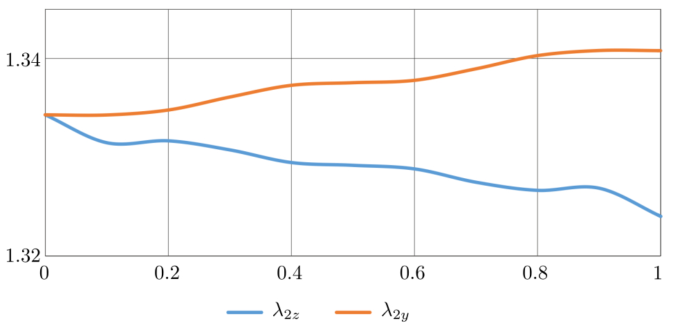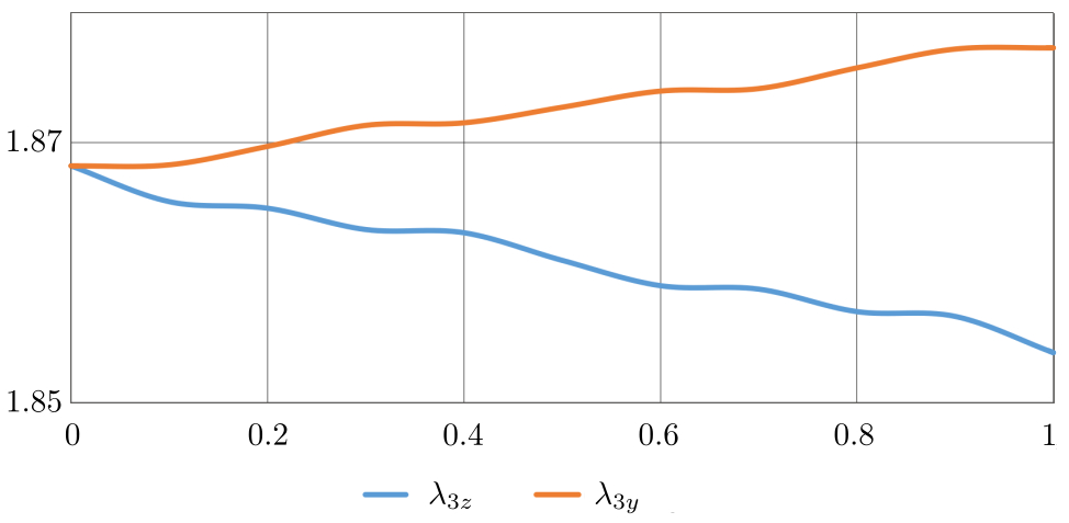 $\lambda_{1z} = 0.80053059$, $\lambda_{2z} = 1.32919190$, $\lambda_{3z} =1.86093715$ — относительно оси $Oz$.