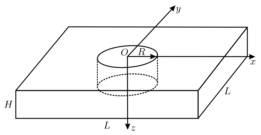 В декартовой системе координат $Oxyz$ рассматривается прямоугольная пластина толщиной $H$, в которой вырезано сквозное круговое отверстие (концентратор напряжений) радиусом $R$ (рис. 1). Перед вырезанием концентратора согласно методике опережающего поверхностно-пластического деформирования верхняя грань пластины ($z=0$) подвергается ультразвуковому (механическому) упрочнению. Вырезание концентратора напряжений (удаление части материала пластины) приводит к перераспределению напряжений и вызывает деформационные процессы, в результате которых происходит изменение геометрической конфигурации исходного кругового концентратора напряжений.