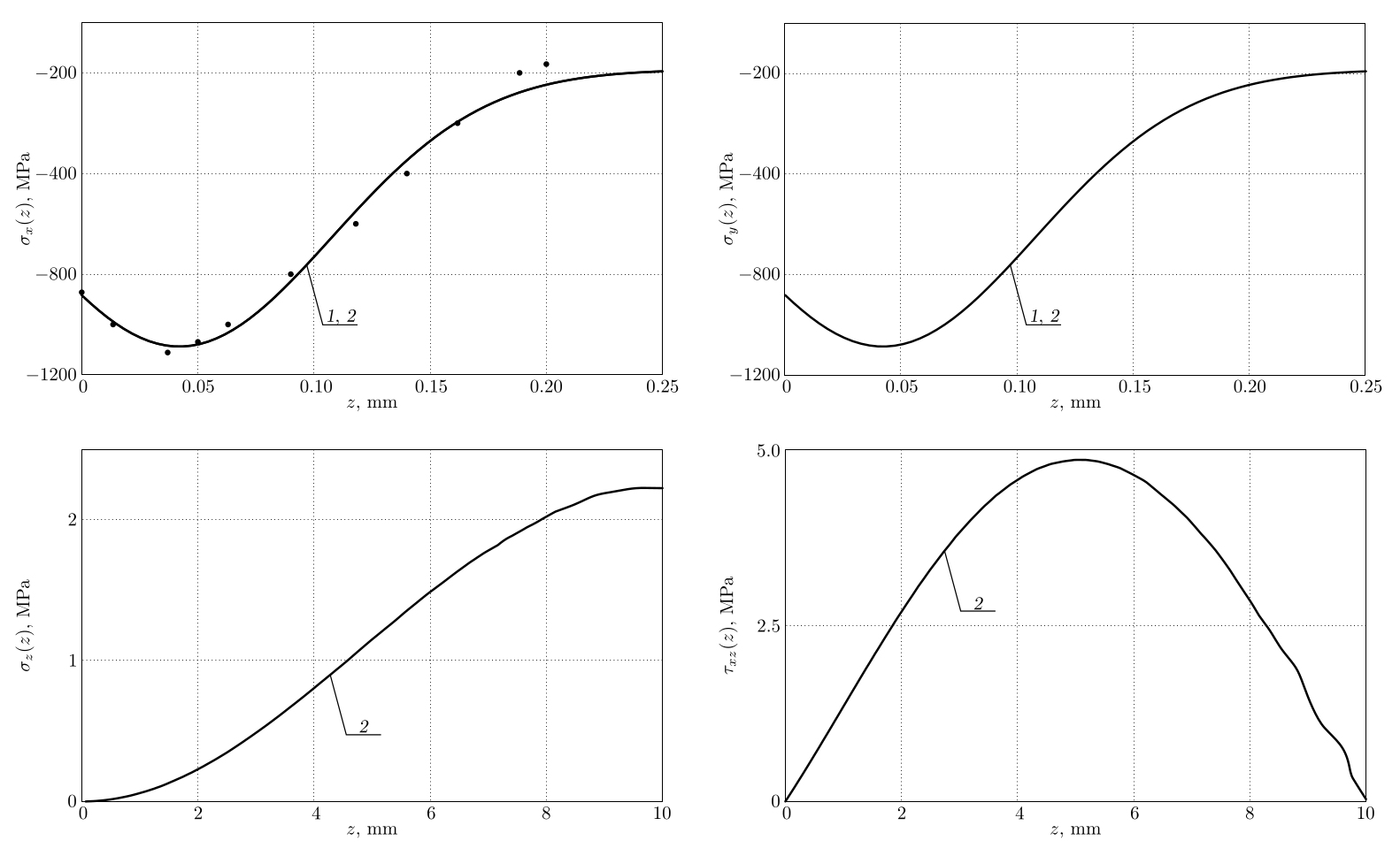 где $\sigma_x=\sigma_x(z)$, $\sigma_y=\sigma_y(z)$ — компоненты тензора остаточных напряжений; $q_x=q_x(z)$, $q_y=q_y(z)$, $q_z=q_z(z)$ — компоненты тензора остаточных пластических деформаций; $E$ — модуль Юнга; $\nu$ — коэффициент Пуассона; $\alpha$ — феноменологический параметр, характеризующий анизотропию технологии упрочнения [8]. Остальные компоненты тензоров остаточных напряжений и пластических деформаций полагаются равными нулю, поскольку их значения (по модулю) на несколько порядков меньше, чем у представленных в (1) [23].