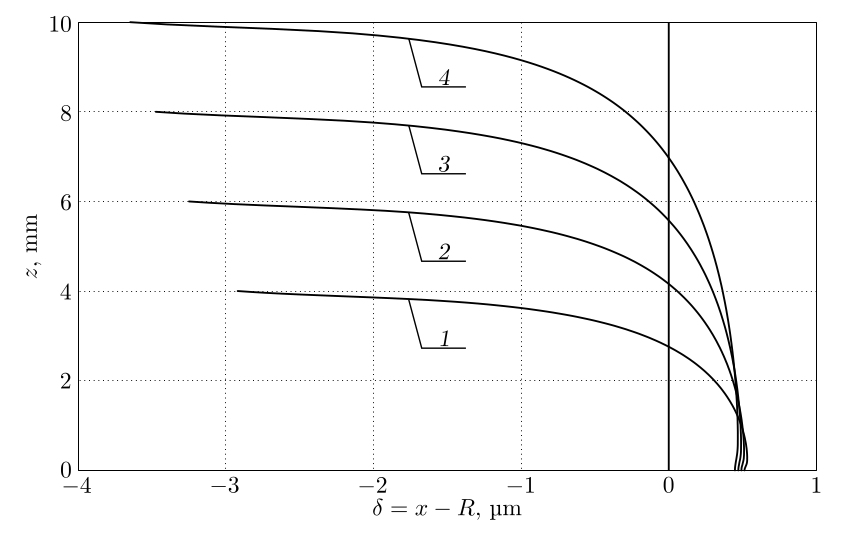 На рис. 3 приведены профили концентраторов напряжений, полученные в результате конечно-элементного расчета, для разных значений $H$ толщины пластины в сечении плоскостью $xOz$ (см. рис. 1). Здесь $\delta = x - R$ — величина смещения расчетного профиля концентратора от его первоначально прямолинейной образующей (линия $\delta=0$ на рис. 3). Из представленных результатов видно, что с уменьшением толщины пластины величина смещения первоначально прямой образующей уменьшается. Максимальное смещение образующей в проведенных расчетах не превысило 4.5 мкм.