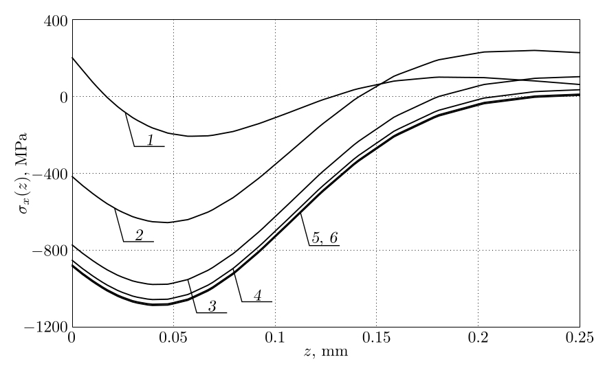 На рис. 4 приведены эпюры величины $\sigma_x=\sigma_x(z)$ для различных значений расстояний $\Delta = (x^2+y^2)^{1/2}-R$ от границы концентратора напряжений в сечении плоскостью $xOz$ ($y=0$). Из приведенных эпюр следует, что вблизи границы концентратора происходит существенное снижение (по модулю) остаточных напряжений. Компонента $\sigma_x=\sigma_x(z)$ асимптотически приближается к соответствующему распределению для пластины без концентратора напряжений и уже для значения $\Delta=30$ мм оба распределения остаточных напряжений (кривые 5, 6 на рис. 4) практически совпадают. Этот факт также может служить одним из элементов проверки сходимости конечно-элементного решения поставленной задачи.
