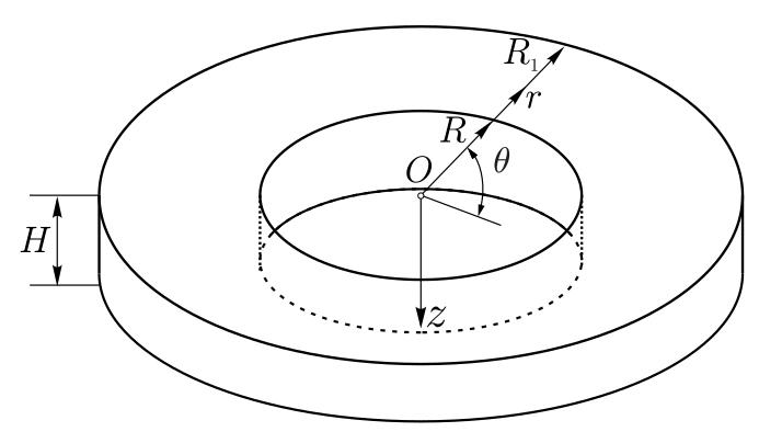 В цилиндрической системе координат $Or\theta z$ рассматривается круговая цилиндрическая пластина с радиусом $R_1$ и толщиной $H$ со сквозным круговым концентратором напряжений радиусом $R$ (рис. 5). Внутренняя поверхность ($r=R$) концентратора напряжений подвергается поверхностно-пластическому деформированию. Требуется определить изменение геометрических параметров внутренней поверхности концентратора, которое возникает из-за перераспределения остаточных напряжений.