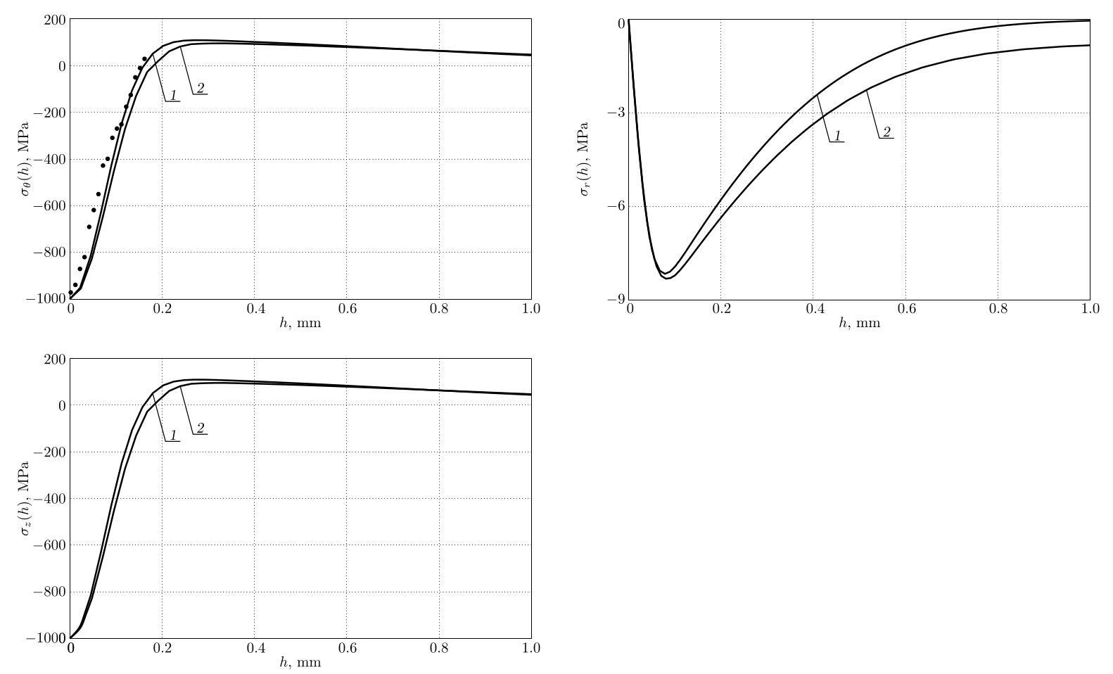 В дальнейших расчетах использовались экспериментальные данные в области сжатия для компоненты $\sigma_\theta=\sigma_\theta(r)$, приведенные в работе [9] для упрочненного цилиндрического образца из сплава ЭИ6986 радиусом 3.76 мм и представленные на рис. 6 маркерами (точки), где $h=r-R$ — глубина упрочненного слоя. Считаем эту эпюру (в области сжатия) модельной и для рассматриваемой задачи. Экстраполяция экспериментальных данных для всей области $R \leq r \leq R_1$ ($R=10$ мм, $R_1=50$ мм) компоненты $\sigma_\theta$ выполнена с использованием зависимости
