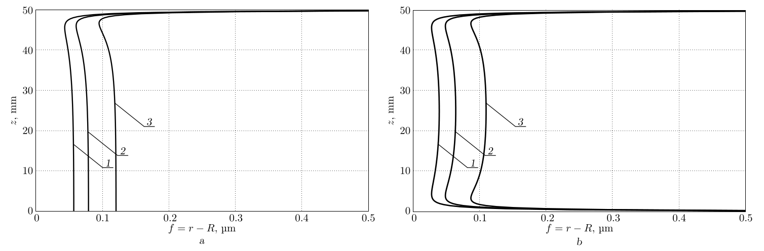 Рис. 7. Профиль образующей концентратора напряжений после упрочнения: \(R=10\) мм (1), \(R=7.5\) мм (2), \(R=5\) мм (3); a — при шарнирном опирании нижней грани пластины, b — при жесткой заделке боковой поверхности пластины