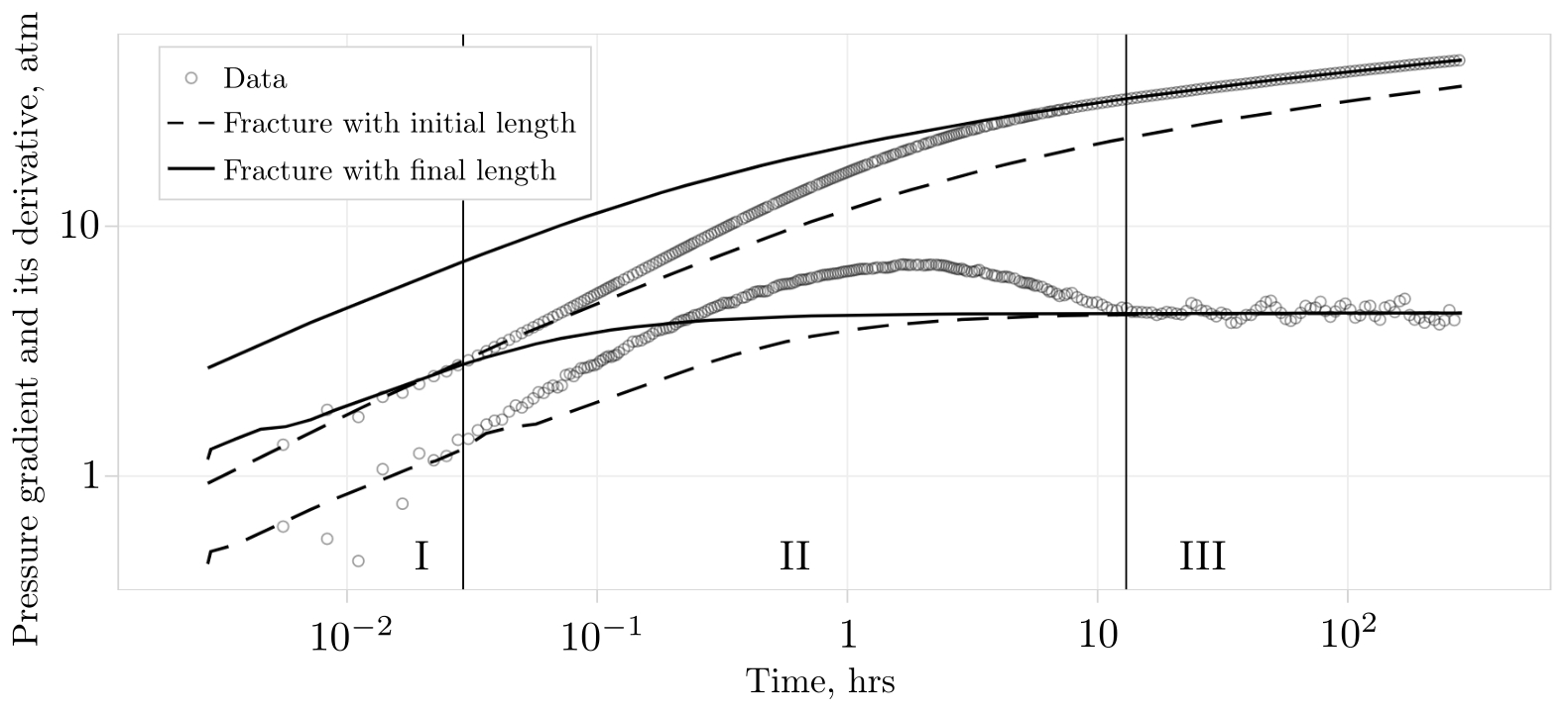Анализ диагностических графиков исследований скважин, в которых наблюдался эффект закрытия трещины автоГРП, позволил выделить характерные участки, на которых происходит изменение производной функции давления (см. рис. 2). Первый участок (I) соответствует линейному режиму течения к трещине с исходной геометрией. На втором участке (II) наблюдается закрытие трещины, что сопровождается характерным изгибом производной. Третий участок (III) диагностического графика описывает радиальный режим течения к трещине со стабильной измененной геометрией.