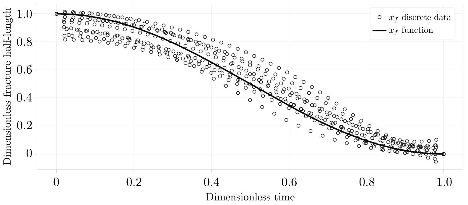 Изменение полудлины трещины $\overline{x}_f$ на этапе закрытия трещины описывается функциональной зависимостью от начальной $x_{f1}$ и конечной $x_{fN}$ полудлин трещины, а также от расчетного давления. Поскольку давление также зависит от полудлины трещины $x_{f}$ согласно уравнению (1), возникает циклическая зависимость. Для упрощения дальнейших исследований зависимость полудлины трещины определяется не от давления, а от времени, что не искажает физический смысл, так как давление также является функцией времени: