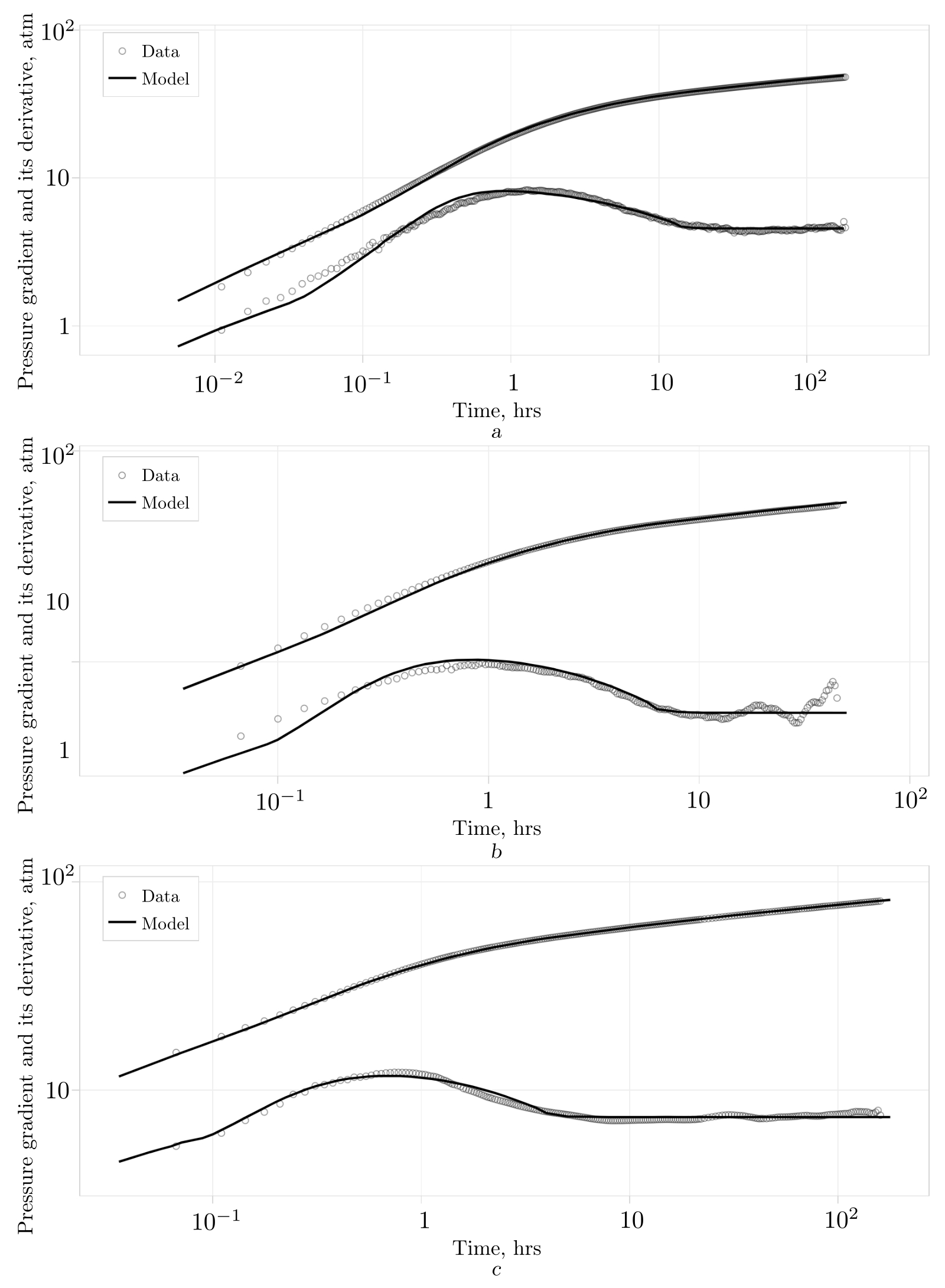 Рис. 5. Сравнение расчетных данных модели с результатами гидродинамических исследований скважин для параметров, приведенных в табл. 1: a — столбец 1; b — столбец 2; c — столбец 3