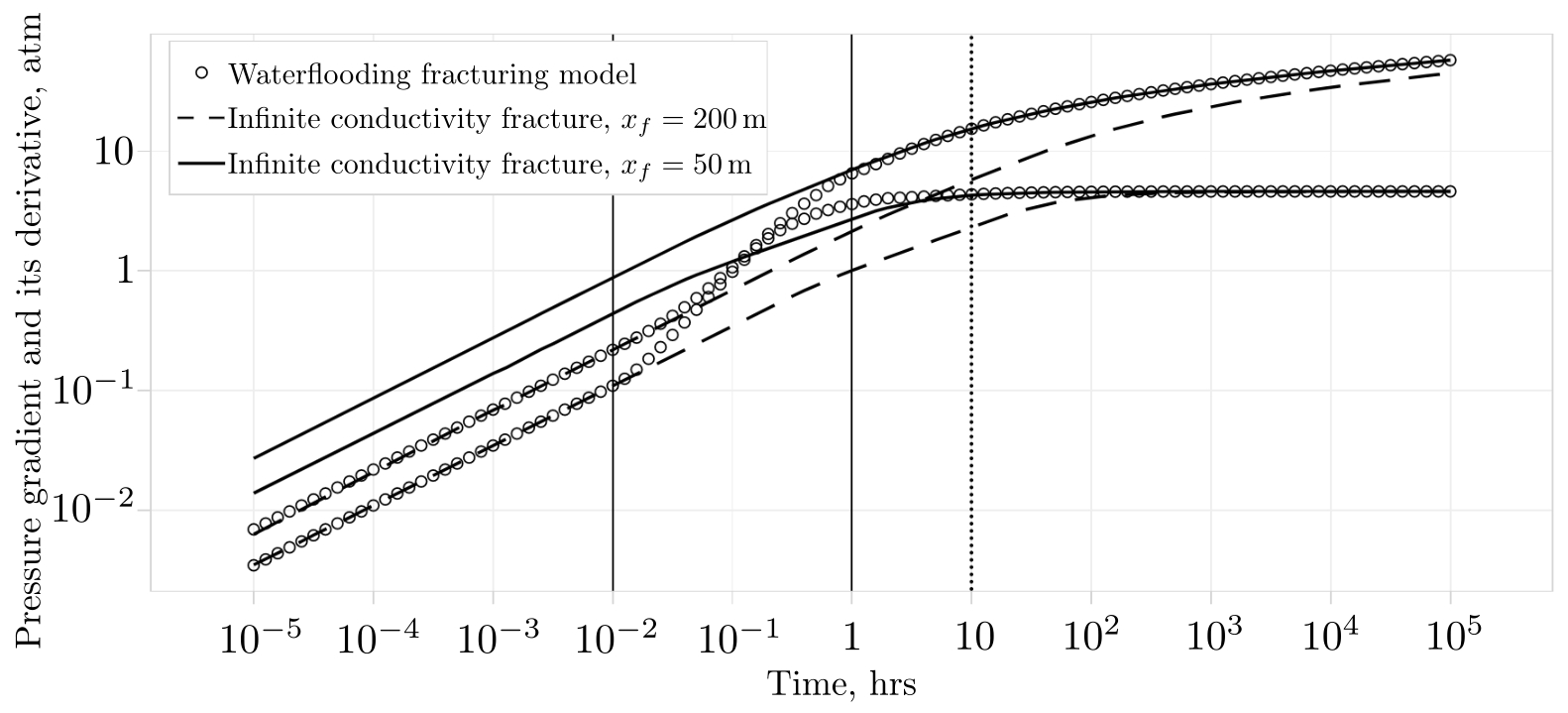 Результаты расчета давления для заданных модельных условий представлены на рис. 6, на котором выделяются три этапа изменения трещины автоГРП: начальный этап, этап закрытия трещины и конечный этап. Начальный этап (в интервале времени $10^{-5}$–0.01 ч) соответствует расчету по модели трещины бесконечной проводимости с начальной полудлиной трещины $x_{fs} = 200$ м. Этап закрытия трещины (0.01–1 ч) соответствует изменению полудлины трещины от начальной $x_{fs}$ до конечной $x_{fe}$. Конечный этап (1–$10^5$ ч) соответствует расчету давления по модели трещины бесконечной проводимости с конечной полудлиной $x_{fe} = 50$ м. Полное соответствие расчета модели трещины бесконечной проводимости при $x_{fe} = 50$ м наблюдается с 10 ч, что связано с применением принципа суперпозиции.