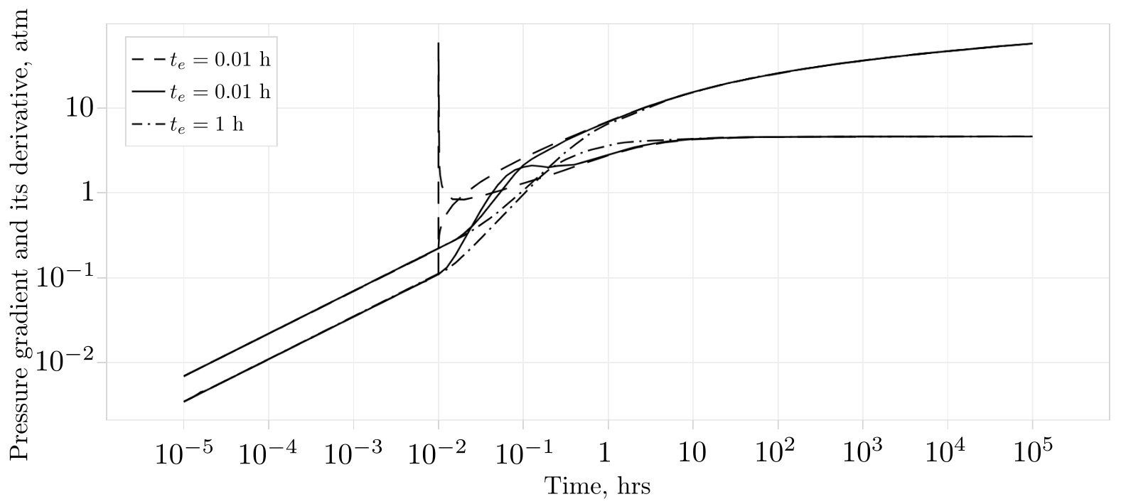На рис. 7 показано влияние длительности закрытия трещины на изменение давления в скважине. Из рис. 7 видно, что при увеличении времени завершения закрытия трещины $t_e$ увеличивается длительность процесса закрытия, а при уменьшении $t_e$ возрастает изменение давления в интервале времени закрытия трещины. При малых значениях $t_e$ (менее $10^{-2}$ ч) на производной может наблюдаться пик. Чем больше время закрытия трещины, тем плавнее происходит изменение перепада давления. С момента начала процесса и до 0.01 ч, а также после 10 ч расчетные значения перепада давления для всех случаев идентичны.