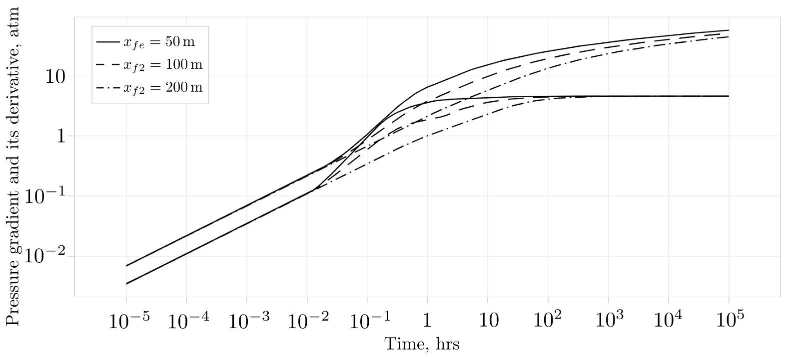 На рис. 8 показано влияние конечной полудлины трещины на изменение давления в скважине. Из рис. 8 видно, что с уменьшением конечной полудлины трещины $x_{fe}$ увеличивается изменение давления с момента начала закрытия трещины (0.01 ч). При уменьшении $x_{fe}$ в 2 раза (с 200 до 100 м) изменение давления в скважине на последней расчетной точке $10^5$ ч увеличивается в 1.145 раза (с 44.672 до 51.132 атм). При уменьшении $x_{fe}$ в 4 раза (с 200 до 50 м) изменение давления увеличивается в 1.288 раза (с 44.672 до 57.516 атм). Производная изменения давления в интервале времени закрытия трещины (0.01–1 ч) возрастает с уменьшением $x_{fe}$. После 500 ч производная изменения давления для всех случаев идентична. При $x_{fe} = 200$ м модель вертикальной скважины с трещиной автоГРП полностью соответствует модели трещины бесконечной проводимости с полудлиной $x_f = 200$ м. Начальный этап (до 0.01 ч) для всех случаев также идентичен.
