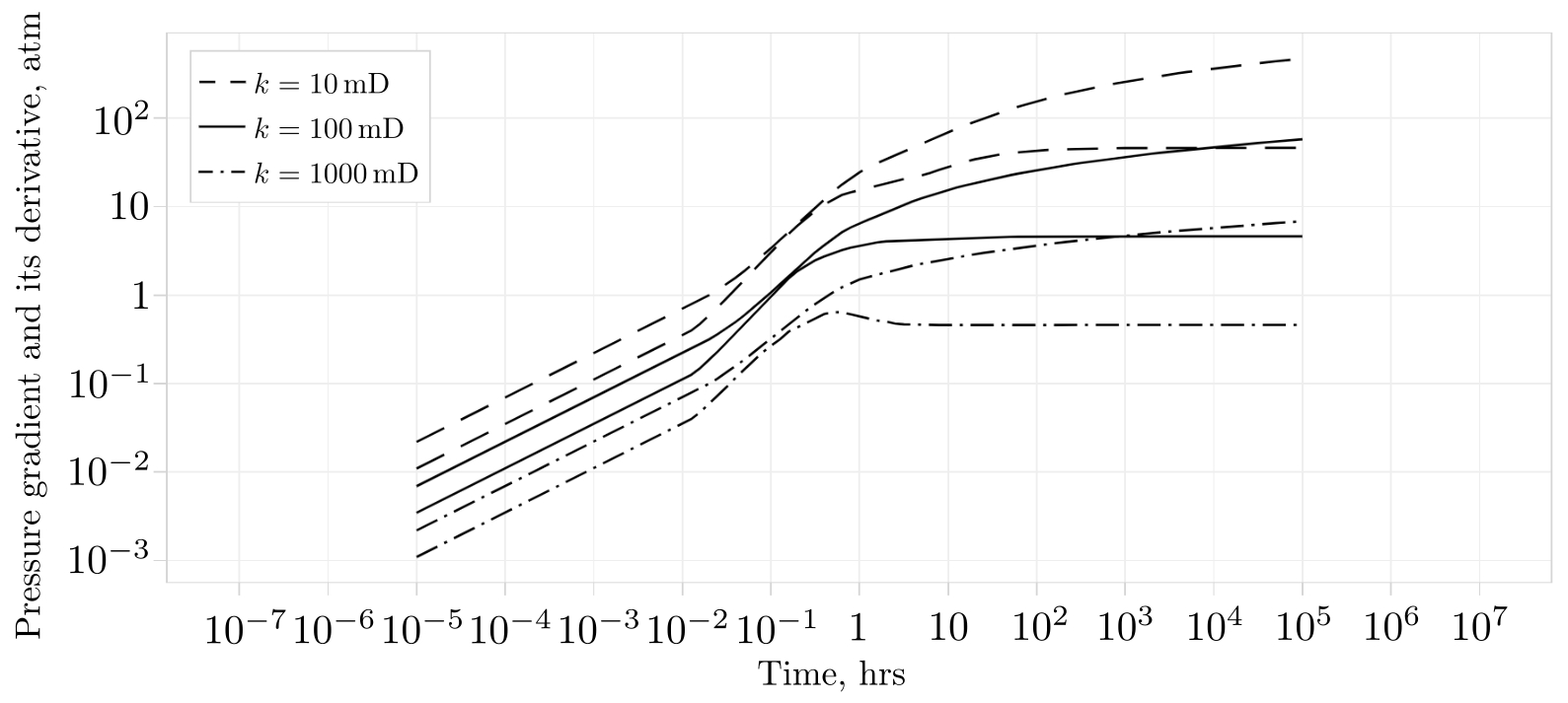 На рис. 9 показано влияние проницаемости пласта $k$ на изменение давления в скважине. Из рис. 9 видно, что с уменьшением проницаемости пласта $k$ увеличивается изменение давления и его производная на всем временном интервале. При уменьшении $k$ в 10 раз (с 1000 до 100 мД) изменение давления в скважине на последней расчетной точке $10^5$ ч увеличивается в 8.443 раза (с 6.812 до 57.516 атм). При уменьшении $k$ в 100 раз (с 1000 до 10 мД) изменение давления увеличивается в 68.865 раза (с 6.812 до 469.119 атм).