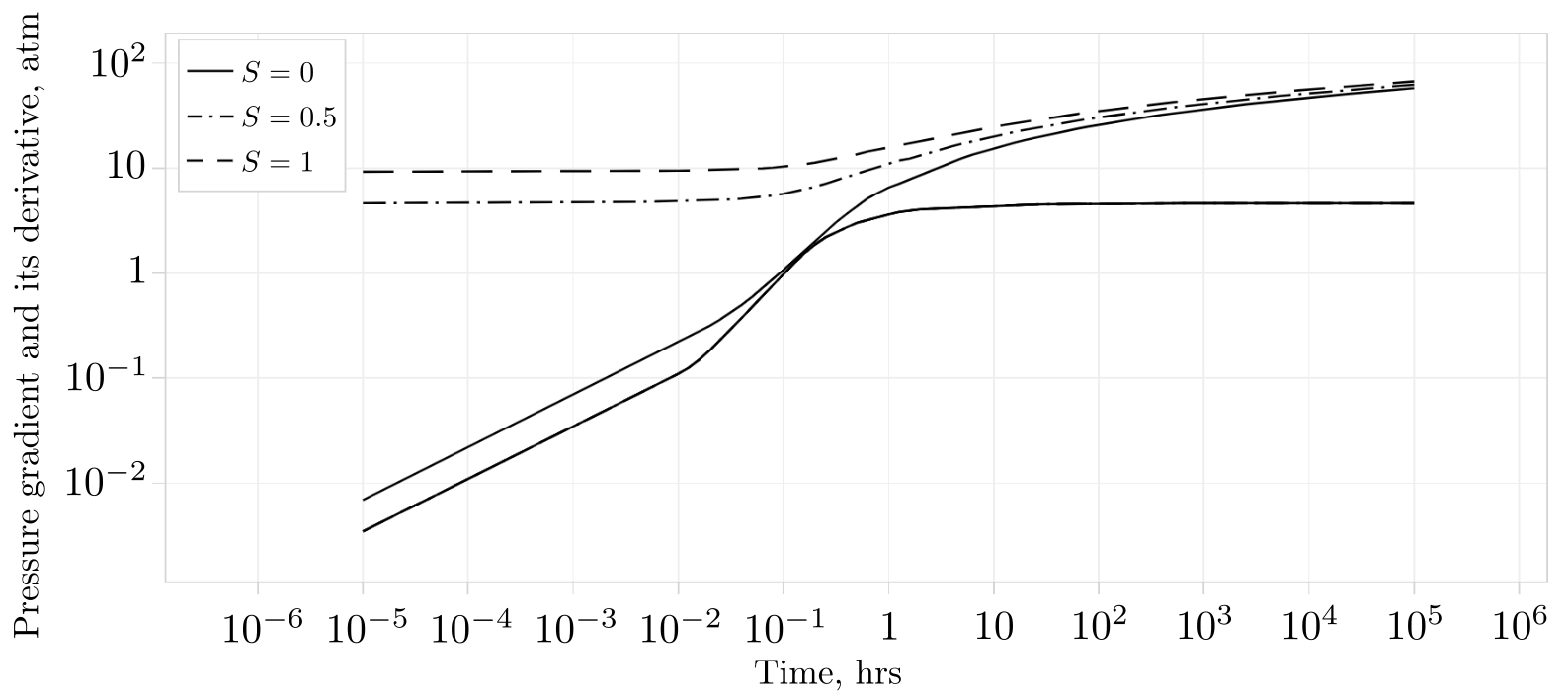 На рис. 10 показано влияние скин-фактора $S$ на изменение давления в скважине. Для учета скин-фактора $S$ в уравнении (1) использованы положения, изложенные в работе [27]. Из рис. 10 видно, что с увеличением скин-фактора $S$ увеличивается изменение давления на всем временном интервале. При увеличении $S$ от 0 до 0.5 изменение давления в скважине на последней расчетной точке $10^5$ ч увеличивается в 1.08 раза (с 57.516 до 62.122 атм). При увеличении $S$ от 0 до 1 изменение давления увеличивается в 1.16 раза (с 57.516 до 66.727 атм). Производная изменения давления для всех случаев идентична на всем временном интервале.