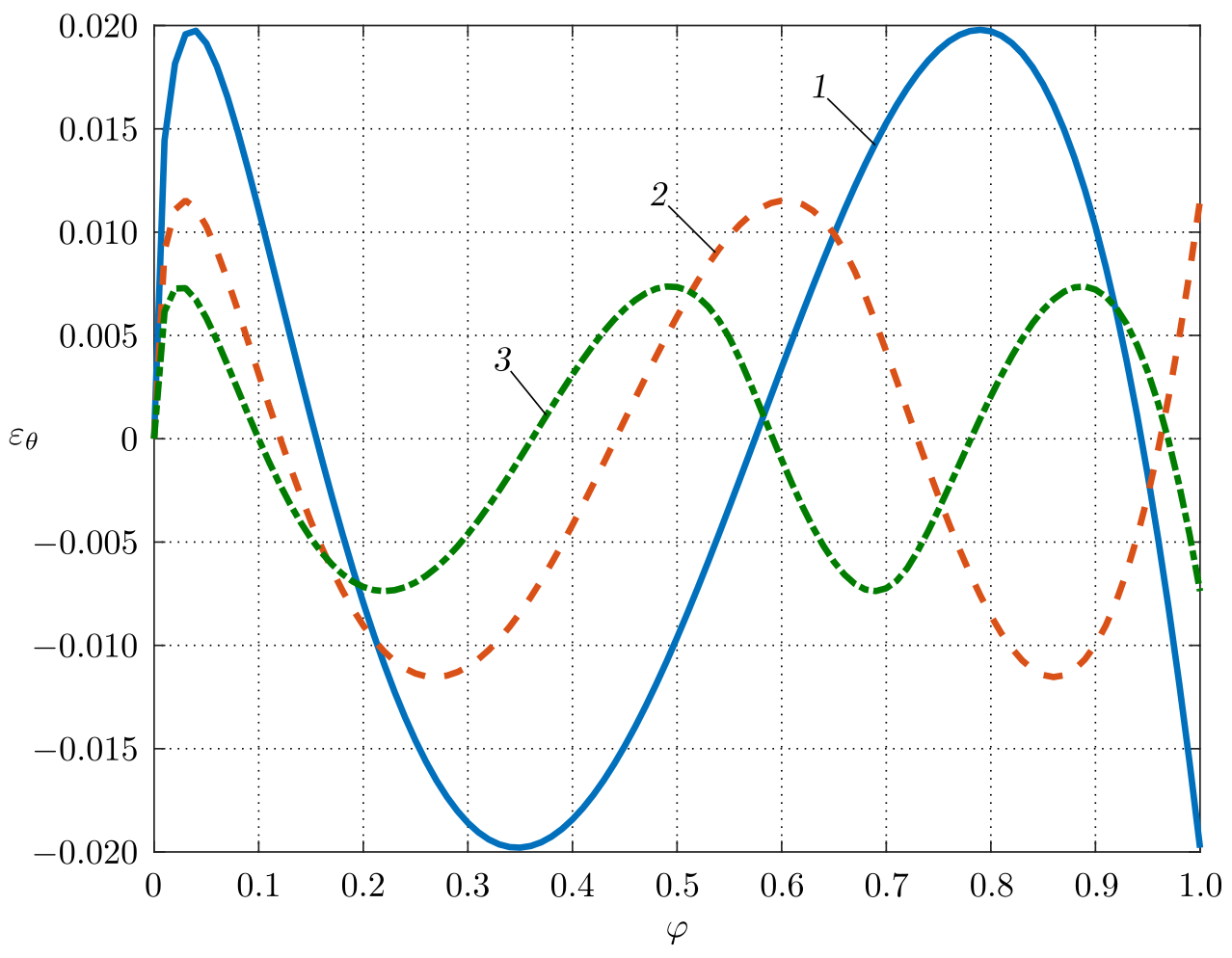 [Figure 1. Error in approximating of the given temperature distribution: 1 — $N=1$; 2 — $N=2$; 3 — $N=3$]