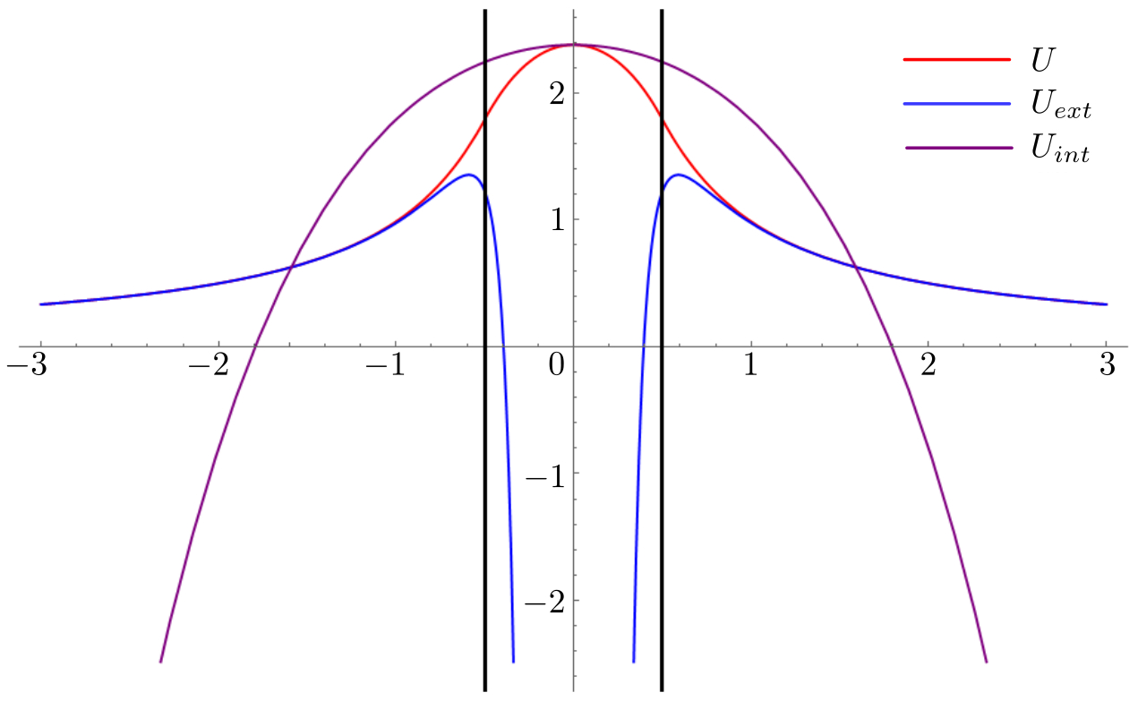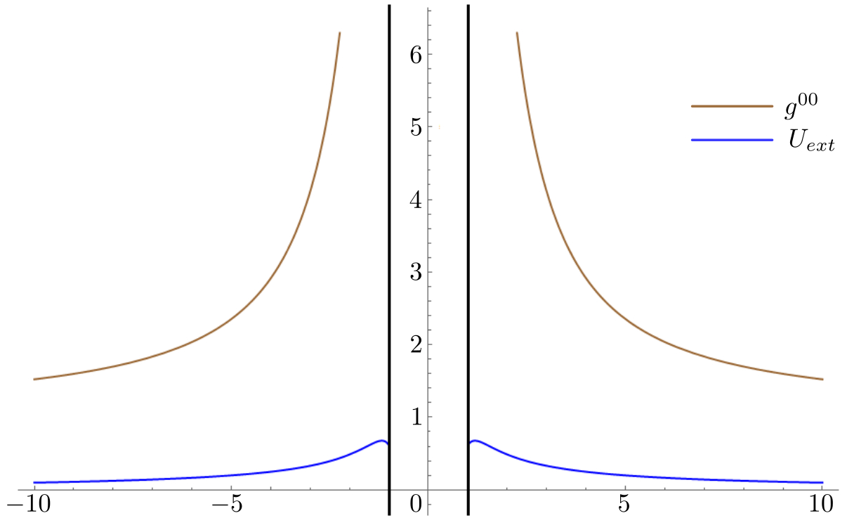 На рис. 6 очевиден вклад релятивистских поправок. Стоит обратить внимание, что функция $g^{00}(x)$ убывает с большей скоростью, чем функция $U_{ext}(x)$, а также имеет большее значение функции при равных значениях аргумента $x$. Черные линии, представляющие границы куба, являются также асимптотой к функции $g^{00}(x)$. Полученные результаты с точностью достаточной для нашей задачи, определяют параметры гравитационного поля для однородного куба, рассмотренного в рамках релятивистского подхода.