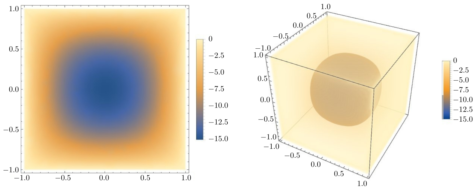 Рассмотрим аналитическое решение уравнения для пространственных поправок (20). Поскольку первый член уравнения (20) зависит от $\rho$, вне куба он обращается в ноль, поэтому первый интеграл конечен. Второй член в (20) не обращается в ноль во всем пространстве, однако на бесконечности обращается в ноль, что также говорит о конечности интеграла. Перепишем уравнение (20) в виде