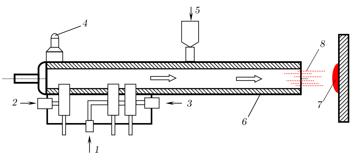 Рис. 1. Принципиальная схема детонационной установки: 1 — горючее; 2 — инертный газ; 3 — кислород; 4 — свеча зажигания; 5 — дозатор подачи порошка; 6 — ствол детонационной пушки; 7 — кумулятивная облицовка, 8 — поток частиц