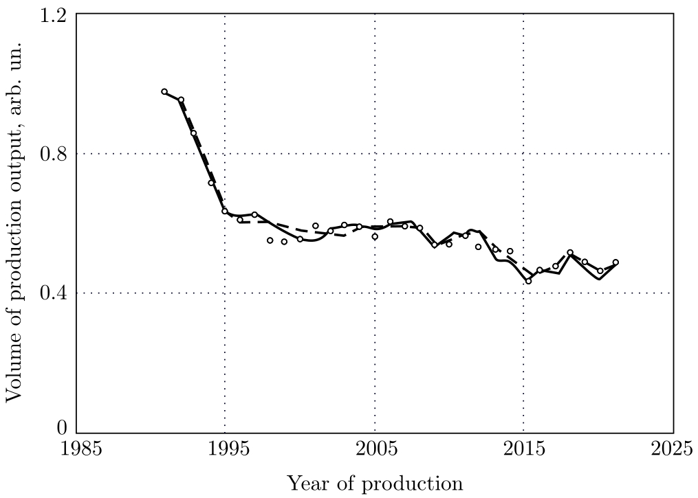 Во-вторых, статистические данные, публикуемые в ежегодной отчетности региональных министерств и энергетических компаний, на основе которых строится математическая модель динамики выпуска продукции энергосистемы, представляют собой временной ряд наблюдений $y_k$, $k=0$, 1, 2, $\ldots$, 31, за период времени с 1990 по 2021 годы. Следовательно, для описания исследуемой динамики целесообразно выбирать модель из класса ковариационно-стационарных моделей временных рядов в форме стохастических разностных уравнений [16–20].