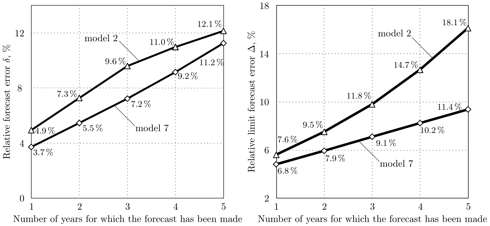 Результаты сравнения точности прогноза на основе известной [1–3] мультипликативно-степенной модели (модель 2, формула (8)) и модели временного ряда в форме разностного уравнения (модель 7, формула (20)) представлены на рис. 2. Видно, что погрешность прогноза $\delta$, сделанного на основе модели 7, существенно меньше (в среднем на 27%) погрешности прогноза, сделанного на основе модели 2. Также видно, что из-за некорректности применения классического метода наименьших квадратов при оценке параметров модели 2 вследствие смещения оценки дисперсии случайного возмущения в результатах наблюдения величина оценки относительной предельной погрешности прогноза $\Delta$ (доверительный интервал) оказывается завышенной.