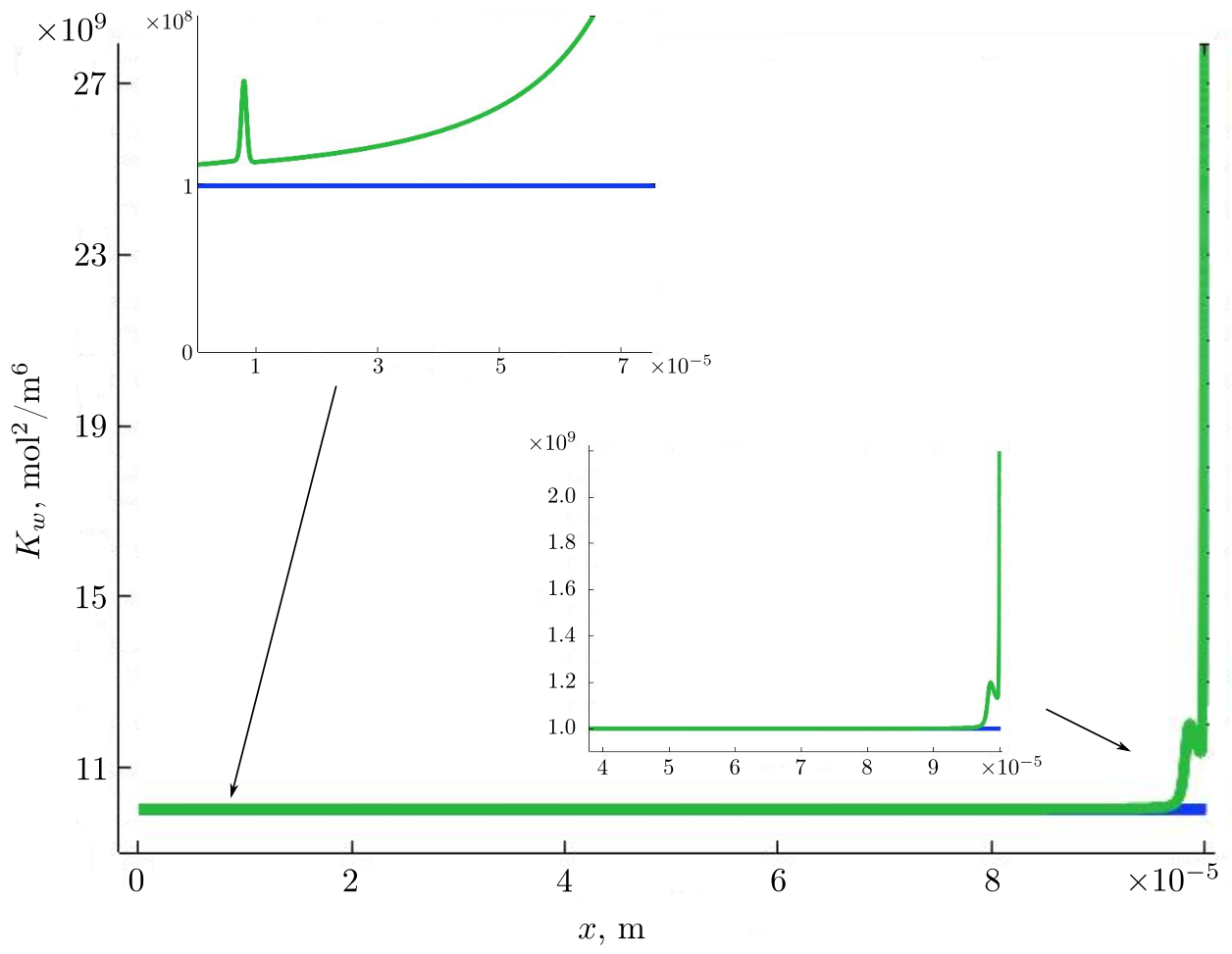 [Figure 3. (color online) Spatial distribution of the modified equilibrium constant $K_w(x) = K_{w_0} + b\rho(x)$ in the diffusion layer, where $K_{w_0}$ is the bulk equilibrium constant and $\rho(x)$ is the space charge density. Insets show magnified regions near the boundaries at $x=0$ (solution bulk) and $x=h$ (membrane interface). Blue curve — $b=10^{-6}$ (space-charge-dependent case); green curve — $b=0$ (reference case with constant $K_w$). The dependence on $\rho(x)$ leads to significant variations near the membrane interface]