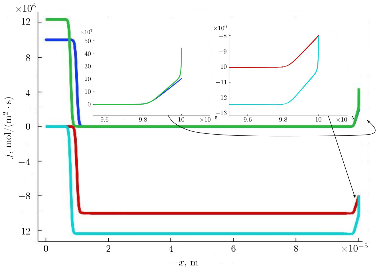 - согласованный экспоненциальный рост потоков ионов $\mathrm{H}^+$ ($j_3$) и $\mathrm{OH}^-$ ($j_4$), что подтверждается результатами численного моделирования, представленными на рис. 4;