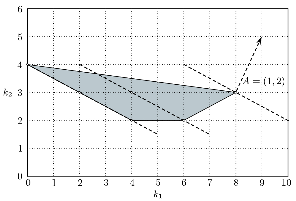 Соответственно, если для некоторого $A \in \mathbb{Z}^2\backslash \{0_{(2)} \}$ $\varphi ^A(x,y)$ — главная $A$-квазиоднородная форма полинома $p(x,y)$, откуда $N_{\varphi ^A} = \operatorname{Arg} \min \bigl\{ \langle A, k\rangle \mid {k\in N_p }\bigr\}$, то, как показано в [2], ей соответствует собственная грань (многогранника $\operatorname{Co} N_p $) $C_A = \operatorname{Arg}\min\bigr\{\langle A, k\rangle \mid k\in\operatorname{Co} N_p \bigr\}$, и при этом