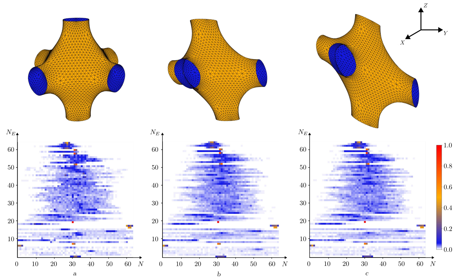 [Figure 3. Example of image histogram $\Gamma$ $64 \times 64$ for P-type TPS based on Linde Type A (LTA) zeolite: a) original TPS; b) TPS obtained by shifting along the $X$ and $Y$ axes by 40 % of the length of the edge of the bounding box; c) TPS obtained by shifting along the $Y$ and $Z$ axes by 40 % of the length of the edge of the bounding box]
