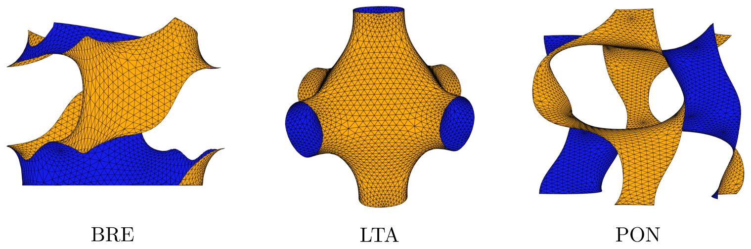 Заметим, что аналогичная задача возникает при обработке изображений, например, при идентификации фотографии некоторого лица среди большого числа фотографий [16]. Одним из развитых методов обработки изображений в задачах такого рода является метод вычисления собственных функций и собственных значений оператора Лапласа–Бельтрами (ОЛБ). Данный подход использовался также на двумерном многообразии в трехмерном пространстве [16] с привлечением совместной байесовской модели машинного обучения [16, 17], что позволило ввести вероятностную метрику в пространстве дескрипторов и определять близость поверхностей по расстоянию в этом пространстве. В настоящей работе этот подход развивается для распознавания (сравнения) поверхностей на множестве так называемых P-поверхностей по А. Шоену [18]: MAPO-39 (ATN), Mg-BCCT (BCT), Brewsterite (BRE), Cobalt-Gallium-Phosphate-5 (CGF), Edingtonite (EDI), Heulandite (HEU), ITQ-12 (ITW), CoAPO-CJ62 (JSW), Laumontite (LAU), Linde Type A (LTA), Merlinoite (MER), Rhodenite (RHO), STA-6 (SAS), Sodalite (SOD), Mu-18 (UEI). Эти поверхности характеризуются различным набором колец и различными пространственными группами, но все являются сбалансированными поверхностями 3-го рода (genus 3) с топологией лабиринтовых сеток — pcu и топологией колец Хопфа — nbo.