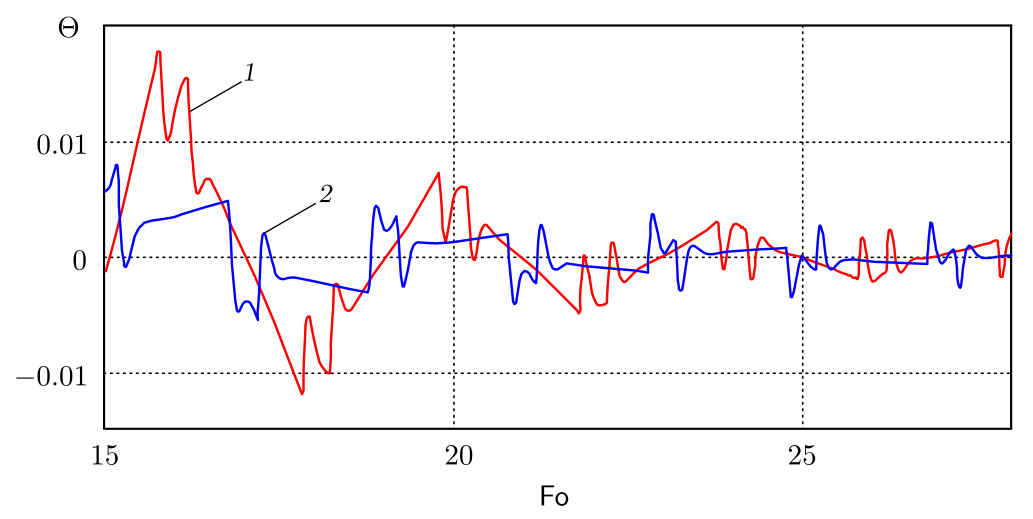 Для моделирования таких пакетов в задаче (14)–(16) первое граничное условие (16) заменяется на (17). Аналитическое решение модифицированной задачи затруднительно, поэтому перейдем к численному методу. Упростим уравнение (14), пренебрегая членами с $\mathsf{Fo}_1^2$ и $\mathsf{Fo}_2^2$.