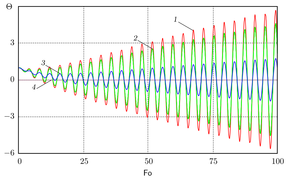 - при $\mathsf{Fo}_1 = \mathsf{Fo}_2 = \mathsf{Fo}_3 = 0$ имеют место незатухающие колебания (консервативная система);