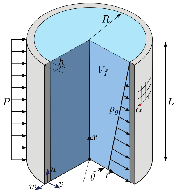 Среди вышеупомянутых публикаций только в статьях [18, 19] представлены результаты исследований предварительно нагруженных слоистых оболочек, полностью или частично заполненных жидкостью. В этих работах изучено изменение собственных частот колебаний при учете либо внешней статической нагрузки, либо гидростатического давления, обусловленного гравитационными силами и действующего на смоченной поверхности. Учет одновременного воздействия статической нагрузки различной природы на критические параметры устойчивости композитных оболочек с разными вариантами укладки и углами армирования в литературе не представлен. Выполнение такого анализа является целью настоящей работы.