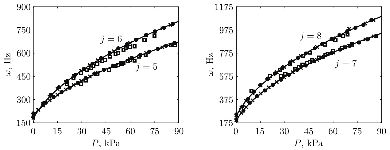 3. Рис. 2. Сравнение собственных частот колебаний $\omega$ нагруженной внутренним давлением $P$ жестко закрепленной пустой оболочки (CC): $\boldsymbol{\square}$ — [47] (эксперимент); $\boldsymbol{\bullet}$ — [7] (МКЭ, 2D); $\boldsymbol{\times}$ — [13] (МКЭ, 3D); сплошная линия — расчет