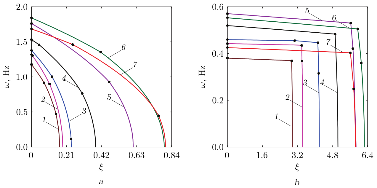5. Рис. 4. Зависимости низших собственных частот колебаний $\omega$ от параметра давления $\xi$, полученные для пустой (a) и полностью заполненной жидкостью (b) двухслойной жестко закрепленной (CC) оболочки при различных значениях угла армирования $\alpha$: 1 — $\alpha=0$, 2 — $\alpha=15^\circ$, 3 — $\alpha=30^\circ$, 4 — $\alpha=45^\circ$, 5 — $\alpha=60^\circ$, 6 — $\alpha=75^\circ$, 7 — $\alpha=90^\circ$