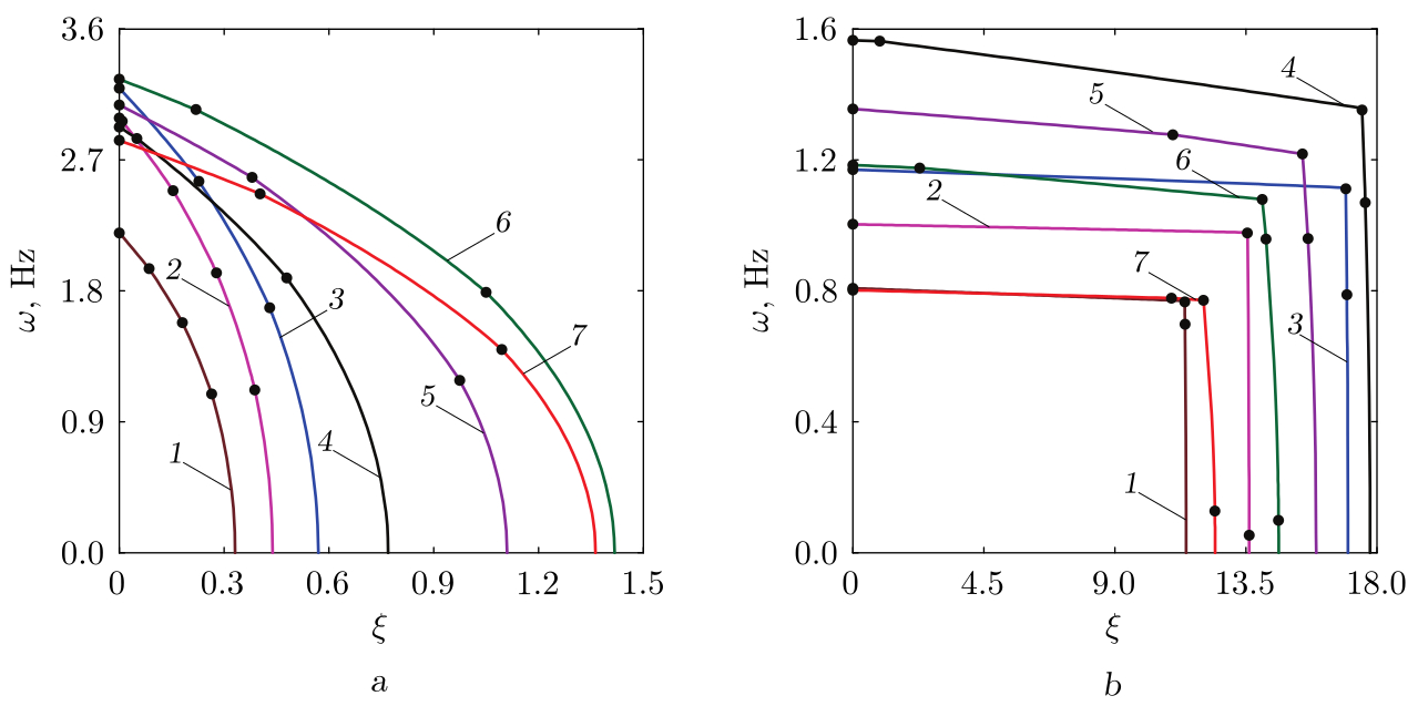 4. Рис. 3. Зависимости низших собственных частот колебаний $\omega$ от параметра давления $\xi$, полученные для пустой (a) и полностью заполненной жидкостью (b) трехслойной консольно закрепленной (CF) оболочки при различных значениях угла армирования $\alpha$: 1 — $\alpha=0$, 2 — $\alpha=15^\circ$, 3 — $\alpha=30^\circ$, 4 — $\alpha=45^\circ$, 5 — $\alpha=60^\circ$, 6 — $\alpha=75^\circ$, 7 — $\alpha=90^\circ$