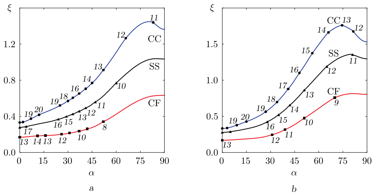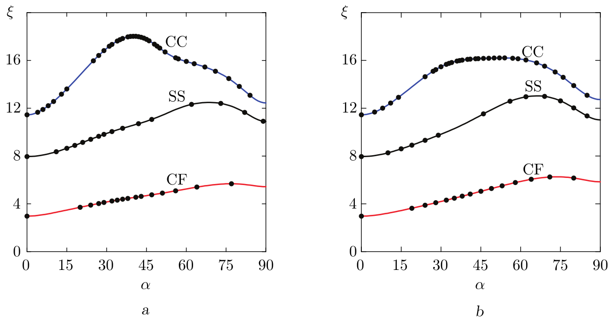 7. Рис. 6. Зависимости параметра давления $\xi$ от угла армирования $\alpha$, полученные для пустых двухслойных (a) и трехслойных (b) оболочек с различными граничными условиями