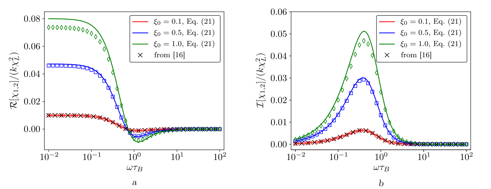 \chi_{1,2} = -\frac{A^2}{10}\frac{f_2(\widetilde{\xi}_0)\bigl(\frac{1}{5}\widetilde{\xi}_0^2-(1+i\omega\tau_B)(3+2i\omega\tau_B)\bigr)-3\widetilde{\xi}_0f_1(\widetilde{\xi}_0)(2+i\omega\tau_B)}{\bigl[(1+2i\omega\tau_B)(3+2i\omega\tau_B)+\frac{1}{5}\widetilde{\xi}_0^2\bigr]\bigl[(1+i\omega\tau_B)(3+i\omega\tau_B)+\frac{1}{5}\widetilde{\xi}_0^2\bigr]} + {}
