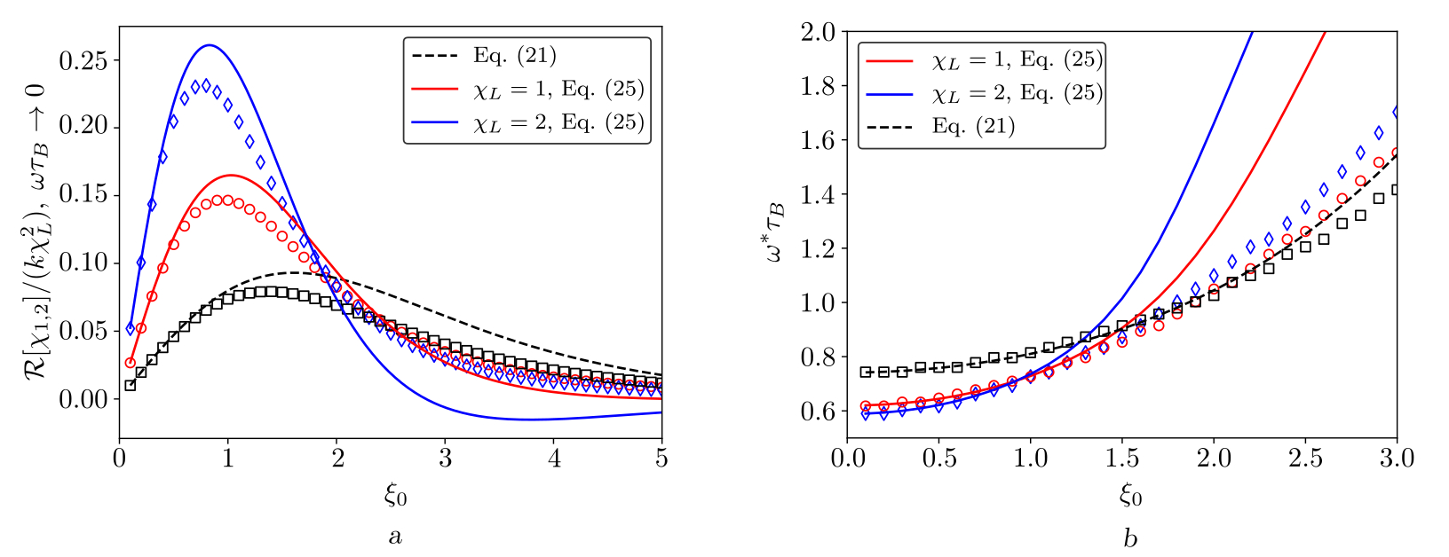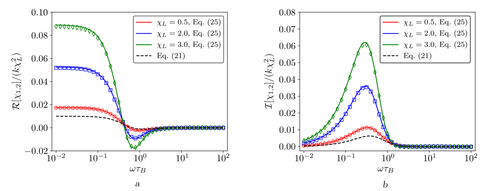 На рис. 3, a представлены следующие данные: сплошными линиями показана зависимость действительной части аналитического решения (25) в статическом пределе ($\omega\tau_B \to 0$) для значений $\chi_L = 1$ и $2$; точками обозначены результаты численного решения уравнения (5) при малой частоте $\omega\tau_B = 0.01$ для тех же значений $\chi_L$; для сравнения пунктирной линией приведена зависимость, полученная по формуле (21), не учитывающая межчастичные взаимодействия, и сопутствующие численные данные.