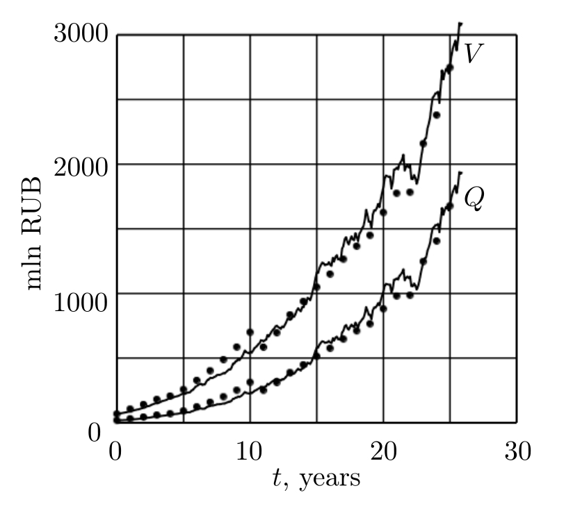 3. Рис. 2. Стохастические траектории роста валового регионального продукта $V(t)$ и регионального производственного ресурса $Q(t)$, полученные численным моделированием по алгоритму (12) и расчетами по формуле (22); точки — статистические данные из табл. 1 и табл. 2