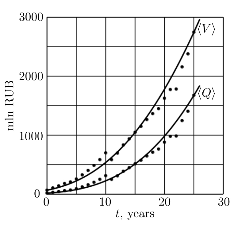 На рис. 3 приведено сравнение математических ожиданий роста объема валового регионального продукта $\langle V \rangle$ и объема регионального производственного ресурса $\langle Q \rangle$, рассчитанных путем численного решения задачи Коши (18), (10) с использованием формулы (22), со статистическими данными табл. 1 и табл. 2.