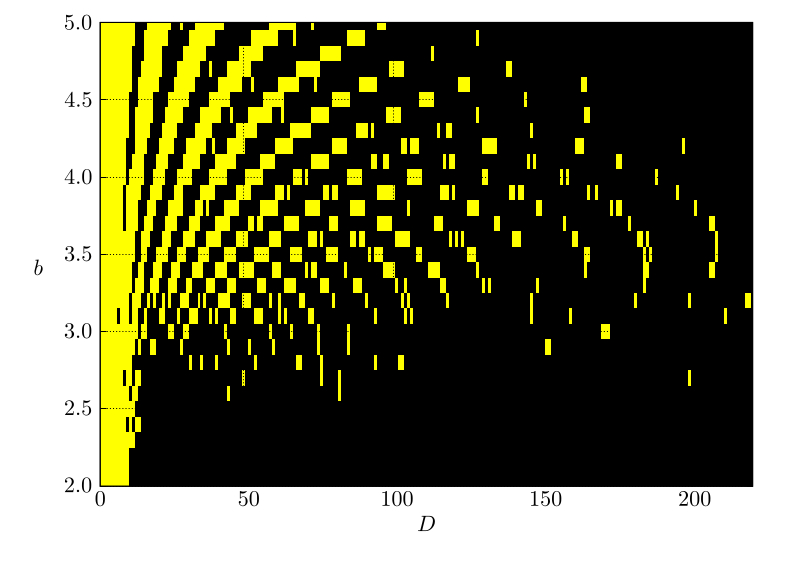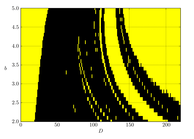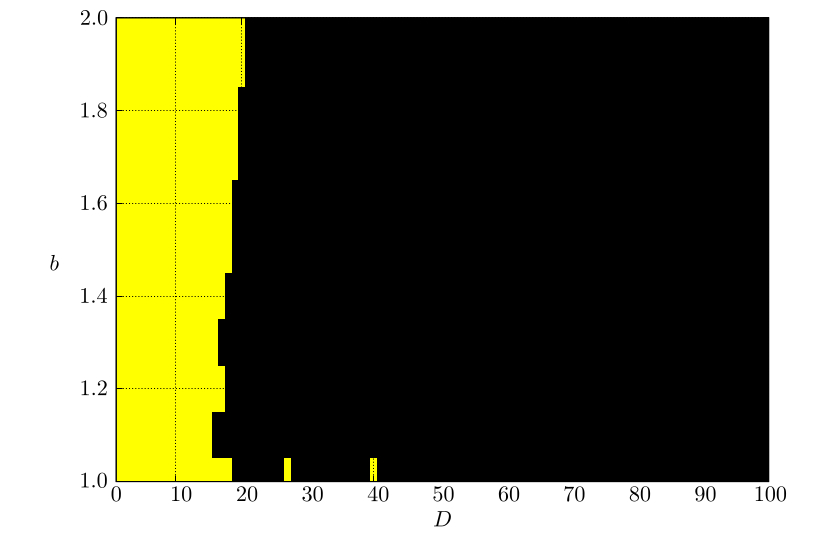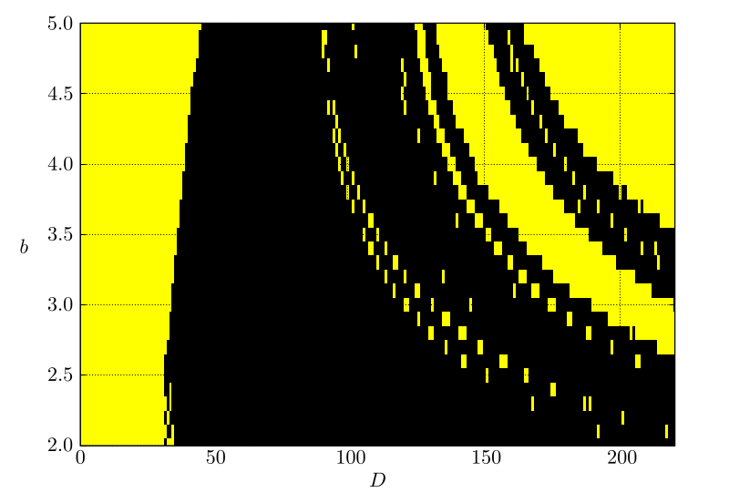 Численное моделирование системы (1) проводилось при следующих параметрах: параметр $D$ варьировался от 2 до 220 с шагом 1, а параметр $b$ изменялся от 2 до 5 с шагом 0.1.