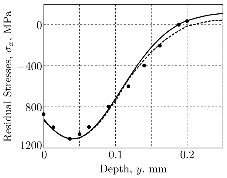 При известных из (5) и (6) значениях $q_{i} (y)$ и заданном распределении температуры $T=T(y)$ по формуле (7) вычисляются коэффициенты температурного расширения $\beta _{i} \bigl(T(y)\bigr)$, необходимые для численного решения задачи фиктивной термоупругости поверхностно упрочненного гладкого образца на основе метода конечных элементов (МКЭ) с целью определения его начального НДС (на рис. 2 полученный результат соответствует штриховой линии).
