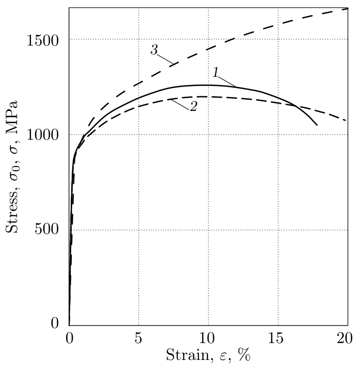 [Figure 3. The stress-strain curves of the EP742 alloy under elastic-plastic deformation at a temperature of 20 °C: 1 — experimental data [23], 2 — calculation in coordinates $\sigma _{0}$ – $\varepsilon $, 3 — calculation in coordinates $\sigma$ – $\varepsilon $]